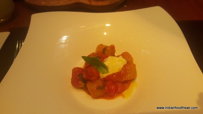 The soups arrived, laid out attractively in two small portions; Zuppa Di Pomodoro E Caprino (Tomato soup, goat cheese, basil – INR 595) and Pasta E Fagioli (Beans, bacon, pasta – INR 595). The first was a joyful blend of four varieties of tomato which made the palette go aaaaah with each spoonful, refreshingly fresh is the only way I can say it.