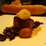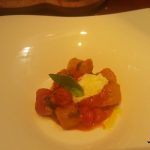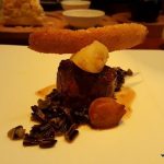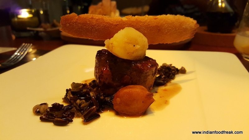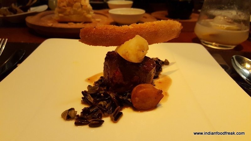 The Risotto Salsiccia E Funghi (risotto with wild mushrooms and homemade pork sausage – INR 995) continued with what I had come to associate with Chef Zorzoli…fresh ingredients with distinct notes of the ingredients. The most interesting part was the Black Garlic which left us excited. I had never seen this before; the peeled garlic was somewhat like a pickle with its very appealing slightly fermented taste and fragrance. Upon asking Chef Zorzoli about it, he replied “we make together”. Now I had something to look forward to even after the lavish dinner. The Barbera D’Alba 2012 which was served with the risotto was a very suitable pairing and was smooth on the tongue. The Dentice Alle Olive (Red Snapper, cherry tomatoes, olives – INR 1690) too was a wonderfully balanced dish loaded with freshness although it was a tad heavy on the salt for my palate. Agnello Castagne E Barcolo (Australian lamp loin, chestnuts, Barolo wine sauce, wild black rice – INR 1950) was cooked medium rare to perfection with the cooked meat appearing a most delightful pink when cut and was completely melt in the mouth in its glorious tenderness.