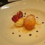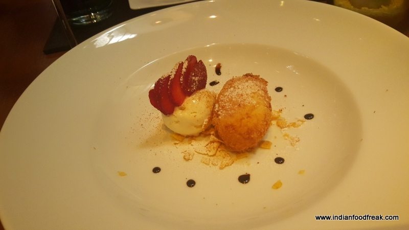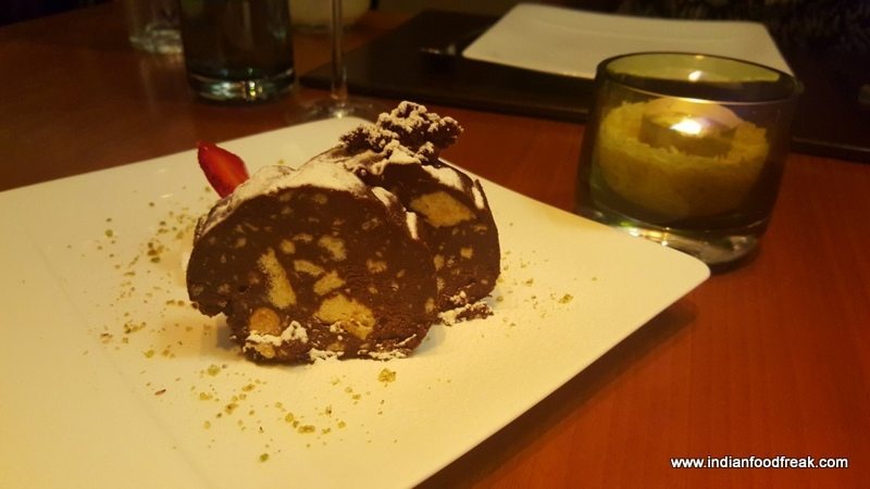 And then it was time for desserts. The stomach satiated to its limits and more, I was hard pressed to find room for the luscious Chocolate Salami with whipped cream which Chef Zarzoli presented before us. There was more – Latte Fritto (Fried milk, cinnamon vanilla ice cream – INR 450) was sinfully delicious and I dug into it with abandon and no regret whatsoever!