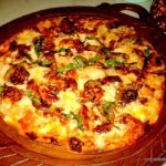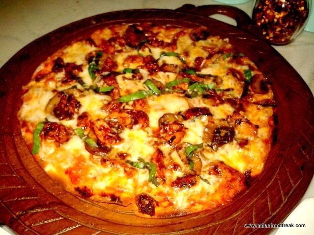 The names of the dishes in the menu had already made us curious. We were served Fish and Chips (Rs.295). The fish was soft and juicy inside with a perfectly crisp outside. Then came the more interesting Sabudana Croquettes (Rs.175) , Neer Dosa Sukka Rolls (Chicken Rs.265 / Veg Rs.245 / Prawns Rs.295) and Vada Pav Sliders (Rs.145). Keeping to their fusion status, all these appetisers were perfectly cooked and very well presented. Their thin crusted Cajun Spiced Chicken Pizza (Rs.265) was really flavourful.