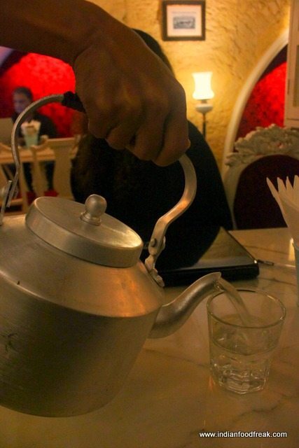 We sat upstairs. When we asked for regular water, they poured the water from an aluminum kettle. If you ask me, that’s something I have grown up with and still have one at home. Familiarity sank in and we smiled at each other. To start, I asked for an Ice Tea (Rs.130) which was regular. The man asked for a Manhattan – Blended scotch, Sweet Vermouth , Bitters ( Rs.360) which was just as strong as he preferred it.
