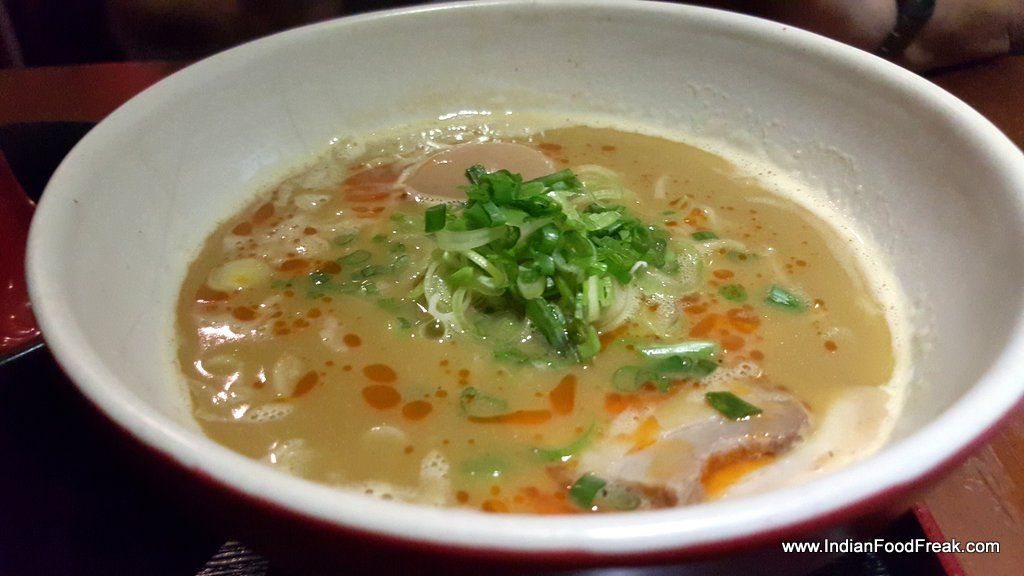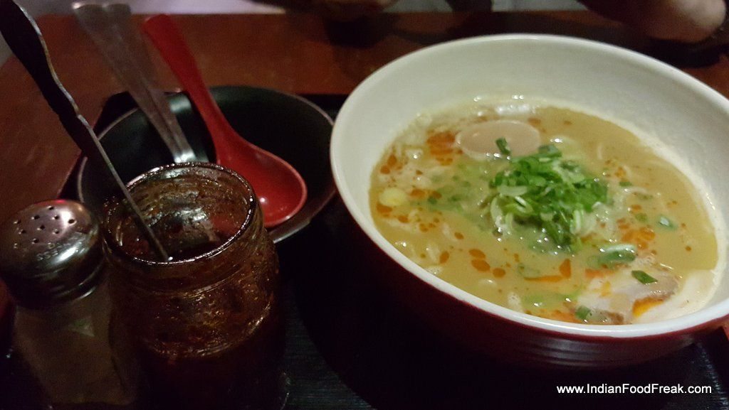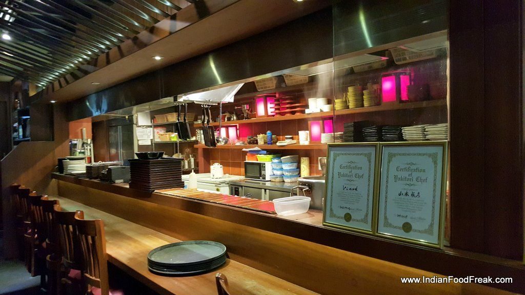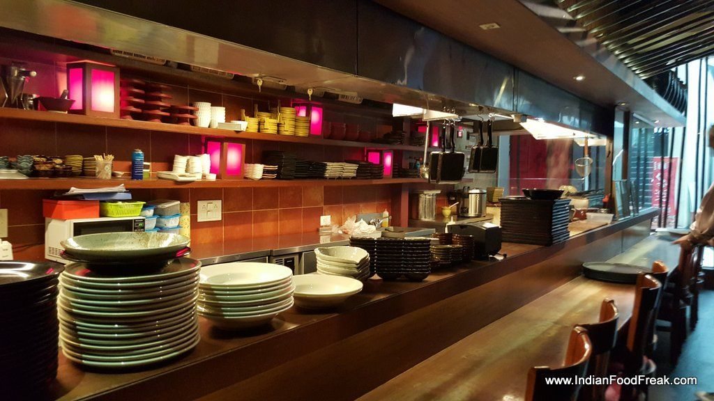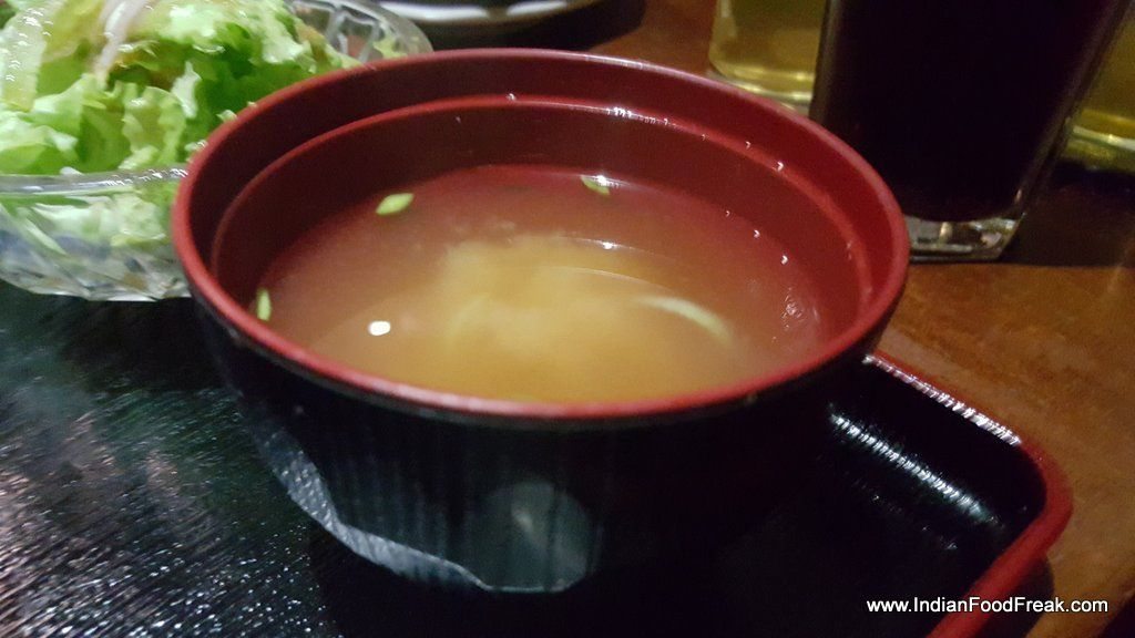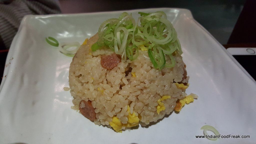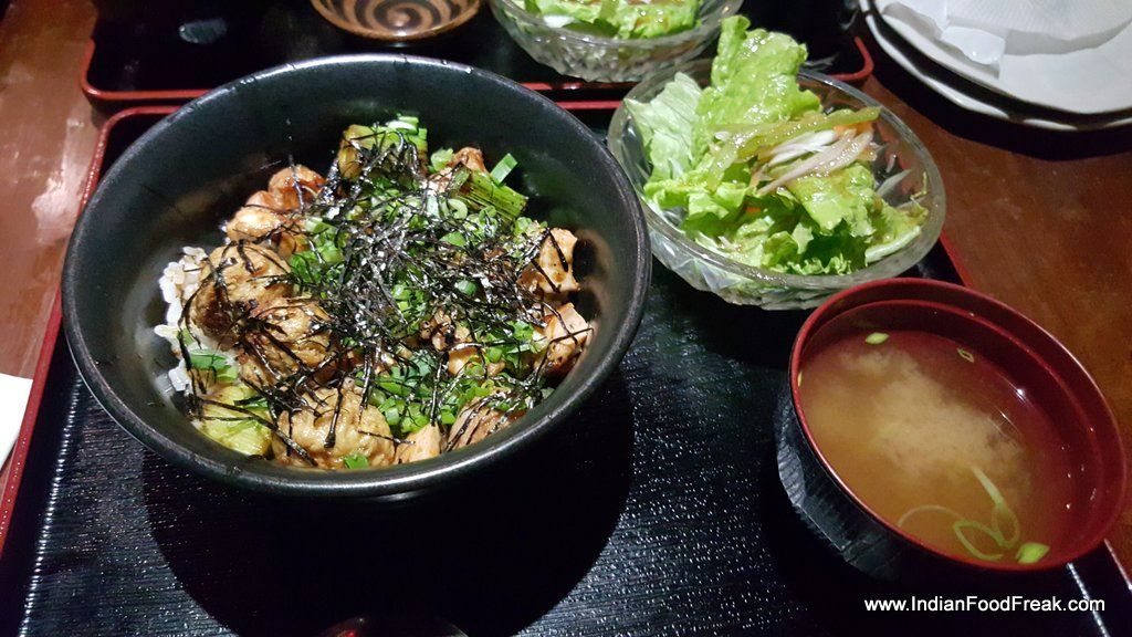 Yakitori Don grilled chicken came resting on thick Tare flavoured sticky rice and garnished with fried seaweed. Mixing diced grilled chicken with chicken mince balls, both highly appealing to Indian taste buds, played upon the texture, expertly. Chahan Gyoza had interestingly served pan-seared chicken dimsum- they came seared on a hot plate in a flower-like pattern. Delightful. The sticky rice served with it was dotted with crispy slices of pork sausage. Both the dishes were accompanied by fresh, crispy lettuce and a small bowl of miso soup. Though we did not order it, only one sushi roll was on the menu- Maharaja Sushi roll made up of Prawn tempura. Chilled Green tea was served as welcome drink.
