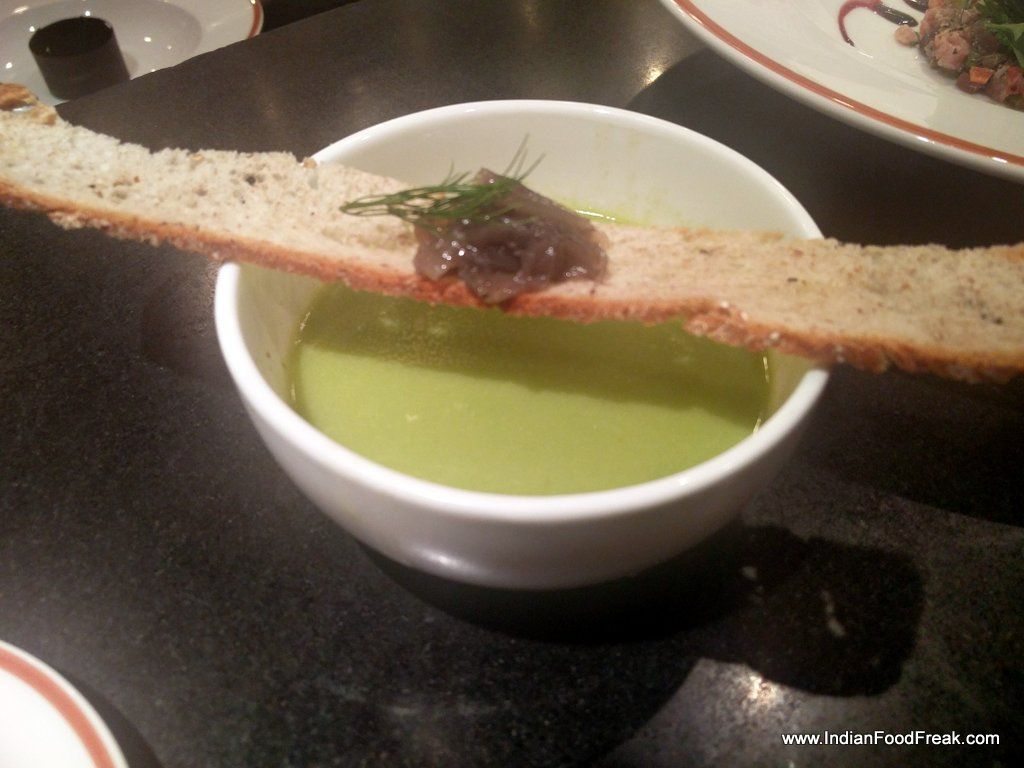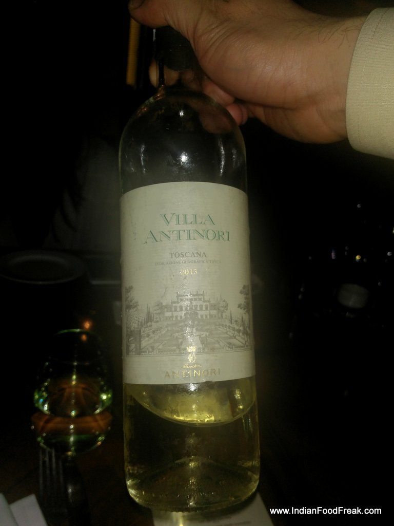 IMG_20160205_201615The next course seats me thinking. Warm asparagus soup is served with cold Vila Antinori bianco. This is a white wine that has three different grapes – Tribiano for dryness, Pino Grigio for sweetness and a local grape of Italy – Malvasia. The asparagus soup is well paired with the earthy, grassy notes of the wine. My predicament was that I have so far not experienced pairing of soup-wine and especially a warm soup and relatively cold wine. Personally I would have changed the kind of soup that would go well with the red that is served at room temperature. Viraj patiently heard my query and told me that while it is not very common to have wine-soup pairing in India and globally it is well accepted. The same was echoed by another of my sommelier friend – Kriti Malhotra.