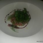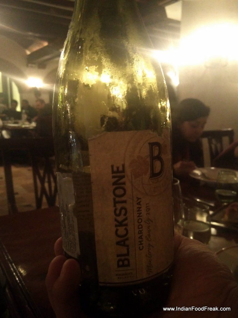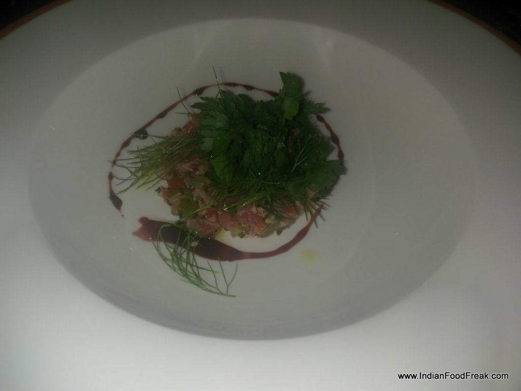 IMG_20160205_205827The next course is Tuna Tartar with red wine reduction. It is paired with Blackstone Chardonnay. This is an oak fermented chardonnay from California and the fruit and creamy notes of the wine goes well with the tuna tarter. The evening is so far like an orchestrated play of music by Chef Alessandro and Sommelier Viraj.