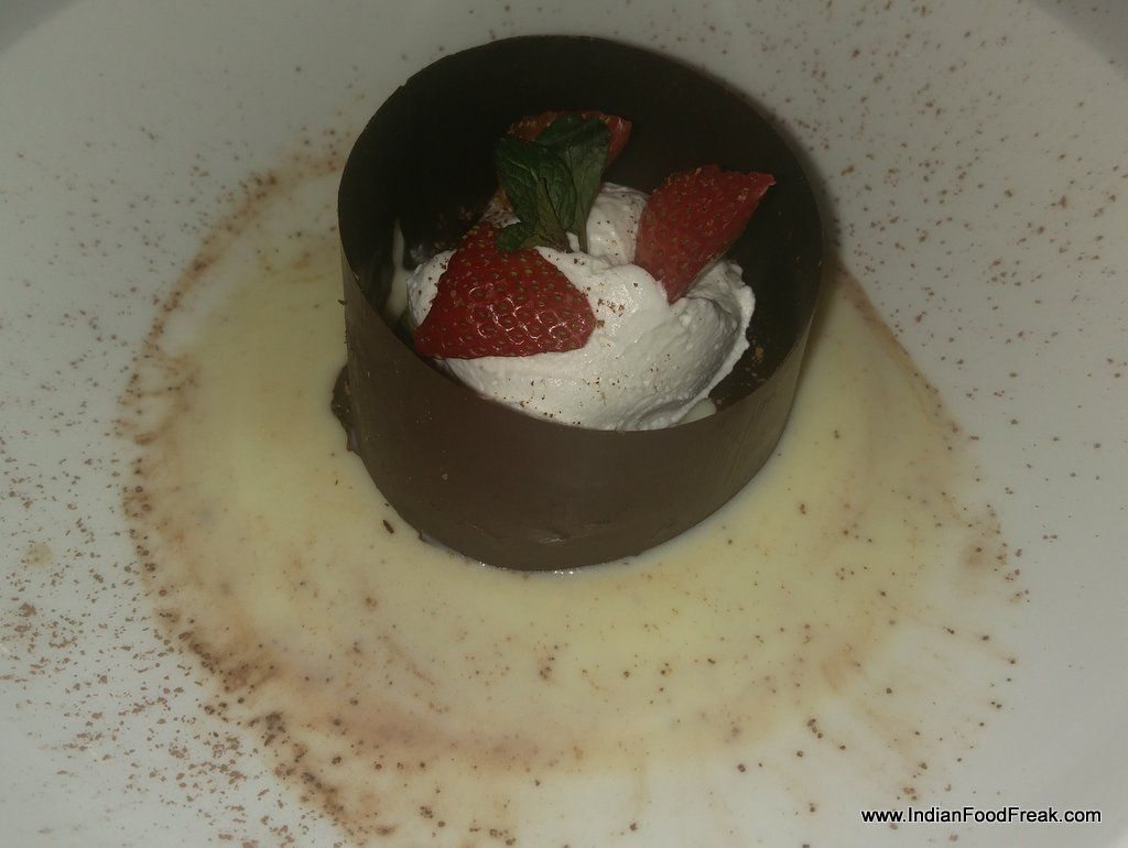 IMG_20160205_223559We end the meal with white chocolate mousse with strawberry ensconced in a chocolate shell. Excellent light dessert, however for such a brilliant meal wish it was paired with dessert wine too. Overall, the special menu is a good way to experience the Italian wines with many flavours of the region with two options in each course that can be enjoyed by vegetarians too.