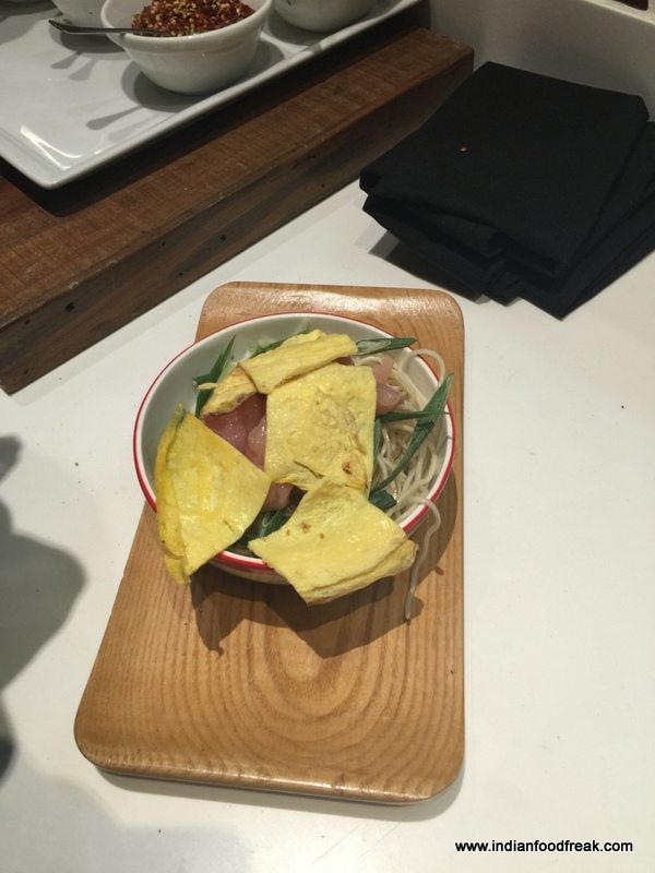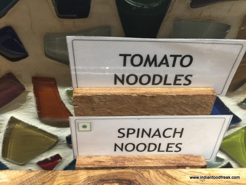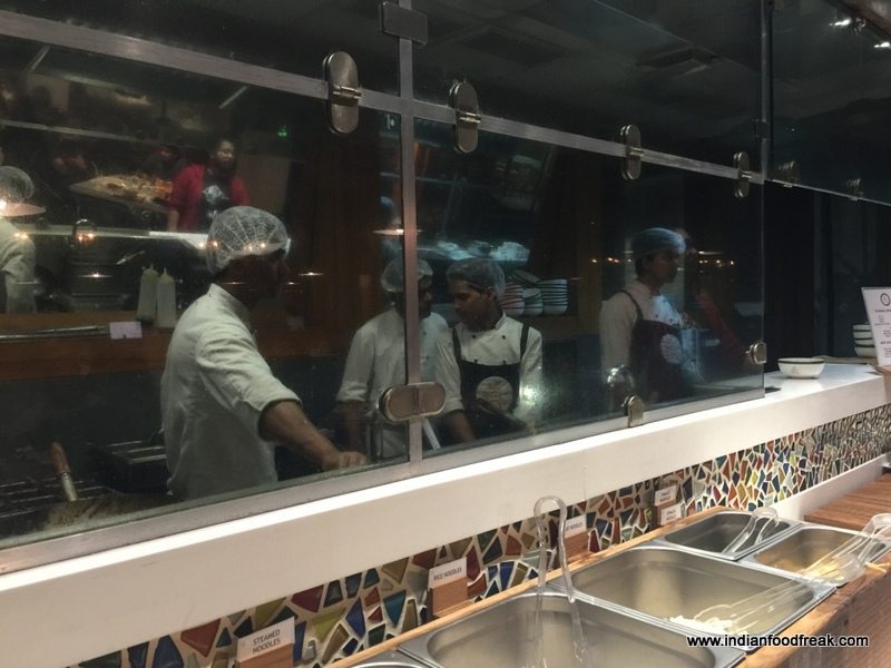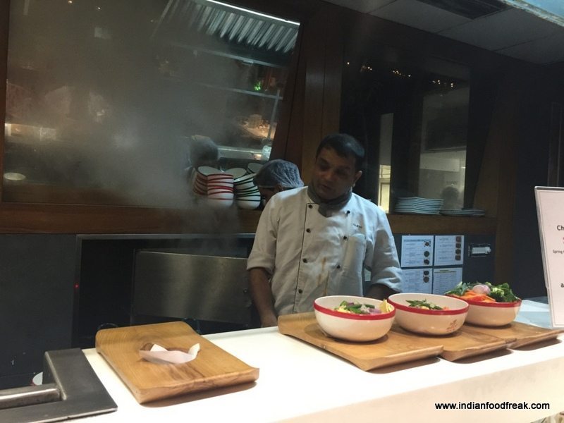 IMG_8837First glance at the ceiling and I liked the colourful wok-clad look. Rather spacious and leading to an open area which one can into through a door, it gave a clean uncluttered look. A community table to seat about 16 people was placed in the centre. And there were smaller tables all around – looked neat and contemporary. What caught my attention was that most of the tables were occupied. A glass partition allowed a viewing of rapid action at the woks; made a mental note to try out a wok for the mains.