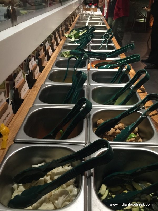 IMG_8823Then it was time for the Wok (INR 730)…the speciality of All Stir Fry. We were handed bowls with red rims which is meant for non-vegetarians; the vegetarians get black rimmed ones. A wide array of vegetables and vegetarian garnish had been placed at one end of long wok station, in the centre were a variety of noodles and rice, and on the other side were non vegetarian options. Here’s how it works – one can have as many refills as they want, so its best if one doesn’t load up the bowls too much at one go. Instructions on the sequence to put the ingredients in the bowl are clearly written and one puts in whatever catches one’s fancy in the bowl, hands it over to the chef, choose a sauce from the range of mild, spicy and hot sauces, request add on condiments like garlic, crushed pepper and voila! There’s a wok one created oneself! If it doesn’t taste wonderful after all the effort, one can go right back and start all over again – and again. Its worth noting that the woks in which the vegetarian and non-vegetarian food is cooked are never ever mixed up. I chose a Mongolian sauce with my prawns and vegetables and flat noodles; didn’t work that great. So went back again and this time had a chicken, pok choi, sun dried tomatoes, jalapeno, broccoli, bell pepper noodle wok done with extra crushed garlic in a Pepper Sauce, wonderful! My son chose his favourite Kung Pao sauce and declared that his wok of roasted lamb, pork sausage and an assortment of vegetables was delicious. His next experiment was a fishy combination of prawns, squid, egg strips with some vegetables in BBQ sauce – not a good combination and he was disappointed with his creation. Unlike the one at Colaba, All Stir Fry at Andheri does not have suggestions about which sauce to use with which combination, would be very helpful if the suggestions are put up here as well.