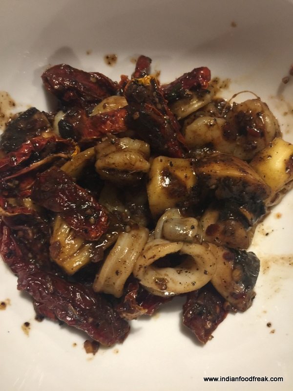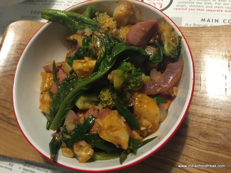 IMG_8778I chose the the Thai Style Tom Yum Phak.(INR 220)..moderately spicy with mushrooms and tofu with a sprinkling of spring onion; pretty good. My son’s Lemon Coriander Soup (INR 200) had a very strong lemon grass taste and was thick with the addition of coconut milk; not bad, but being loaded with vegetables made it rather filling; would have worked better if it was a tad lighter and had less vegetables in it.