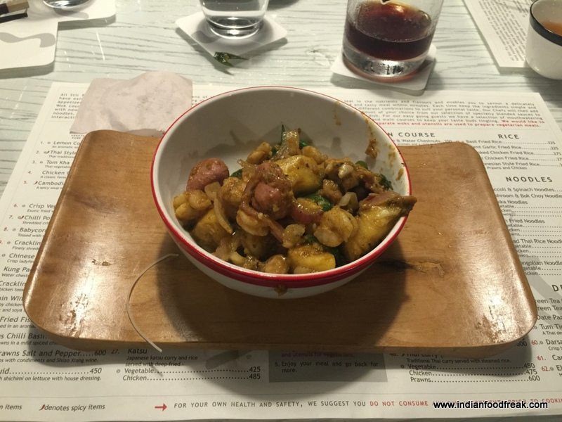 IMG_8787Our starters were Crackling Chicken (INR 350) which didn’t work very well for me as the chicken seemed overcooked thus rendering it dry with no distinct taste, apart from the rather overpowering taste of chilly with lingers despite the honey laced coating. Couldn’t find taste the shredded spinach which had been added to the dish. The starter which won hands down was the Chin Win Chicken (INR 350) – the chicken was cooked deliciously perfect; the sauce, despite being a bit sweeter than expected, tasted good! I ate more of it than I should have and hoped I still would have room for the wok. The Crackling Spinach (INR 300) was lots of sesame added to it which I liked,but I found the sugar to be a bit in excess which has a lingering taste; the sweetness is a matter of personal preference of course.