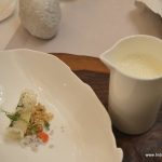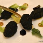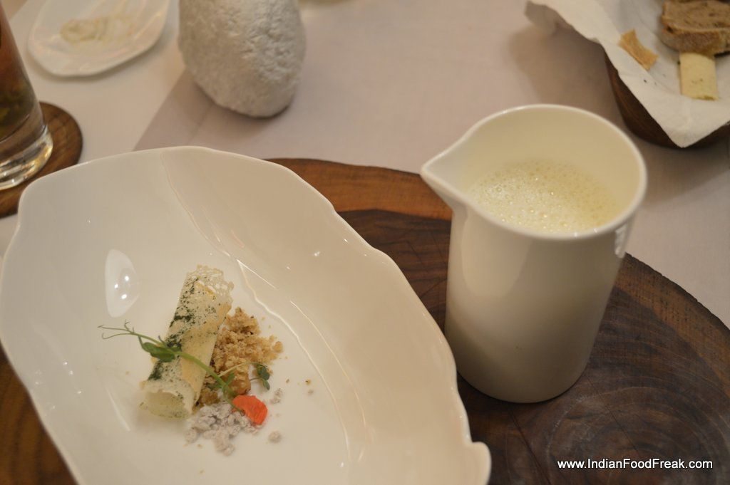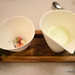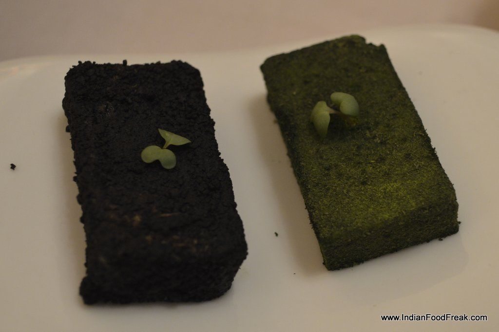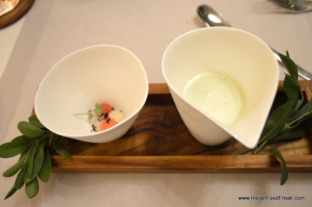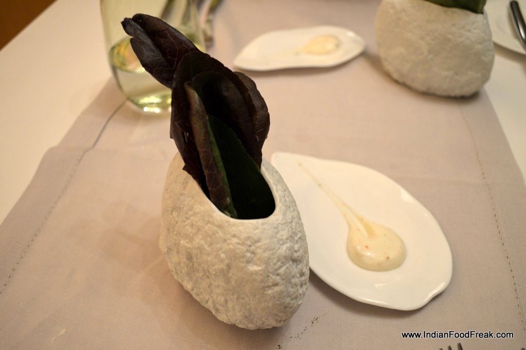 Farm to fork idea that is fast catching up in our culinary milieu is reminiscent of JIT (just in time) manufacturing followed by leading businesses of the world. At Pluck, food is prepared as practicably as possible, by using freshly grown vegetables and herbs from the not too modest patch of in house garden at the Pullman’s. So, you are welcomed by a crunchy swathe of fresh lettuce literally plucked just then from the garden and served with the chef’s mayonnaise of the day. The first evening, it was a Japanese herb flavoured one and on the second anonymous visit, the sauce ‘curried” flavour. Amuse bouche was an exquisite Chilled Melon and Watermelon soup on the first visit and subsequently, a Diced Apple and Cucumber chilled salad garnished with olive dust. The crusty breads came with tiny bricks of Parsley and Olive coated butter, made to look like loamy soil with tendrils sprouting out of it, a detail that is simply, art.
