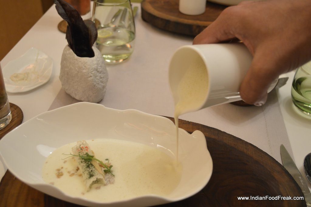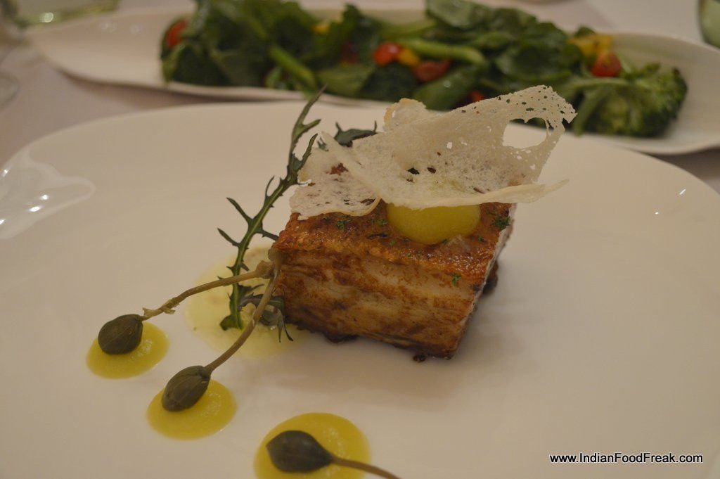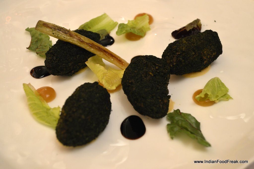 Farm to fork idea that is fast catching up in our culinary milieu is reminiscent of JIT (just in time) manufacturing followed by leading businesses of the world. At Pluck, food is prepared as practicably as possible, by using freshly grown vegetables and herbs from the not too modest patch of in house garden at the Pullman’s. So, you are welcomed by a crunchy swathe of fresh lettuce literally plucked just then from the garden and served with the chef’s mayonnaise of the day. The first evening, it was a Japanese herb flavoured one and on the second anonymous visit, the sauce ‘curried” flavour. Amuse bouche was an exquisite Chilled Melon and Watermelon soup on the first visit and subsequently, a Diced Apple and Cucumber chilled salad garnished with olive dust. The crusty breads came with tiny bricks of Parsley and Olive coated butter, made to look like loamy soil with tendrils sprouting out of it, a detail that is simply, art.