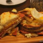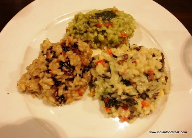 While the drinks were good, the same cannot be said about the food. The first dish that we asked for was Hawaian Chicken Salad with Maharaja dressing. We were not too impressed. Then came the Mixed Grill Platter of Chicken, Fish and Prawn which was really good and very flavourful; the Arabic Shish Tawook Wrap was disappointing with very chewy chicken filling. We liked the Chicken Croque Monsieur with Egg. This came with a portion of French fries. From the mains, we asked for Risotto which was really well prepared and presented with 3 different flavours – Pesto, Balsamic and Mushroom. However the other main course of Basa wrapped Prawn was average. I found that slightly high on salt which was off putting.