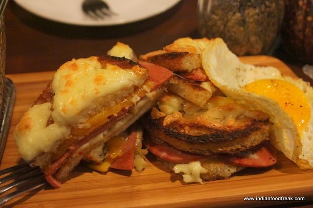 While the drinks were good, the same cannot be said about the food. The first dish that we asked for was Hawaian Chicken Salad with Maharaja dressing. We were not too impressed. Then came the Mixed Grill Platter of Chicken, Fish and Prawn which was really good and very flavourful; the Arabic Shish Tawook Wrap was disappointing with very chewy chicken filling. We liked the Chicken Croque Monsieur with Egg. This came with a portion of French fries. From the mains, we asked for Risotto which was really well prepared and presented with 3 different flavours – Pesto, Balsamic and Mushroom. However the other main course of Basa wrapped Prawn was average. I found that slightly high on salt which was off putting.