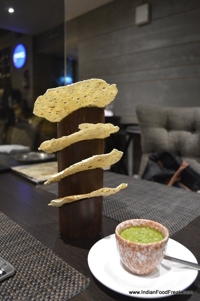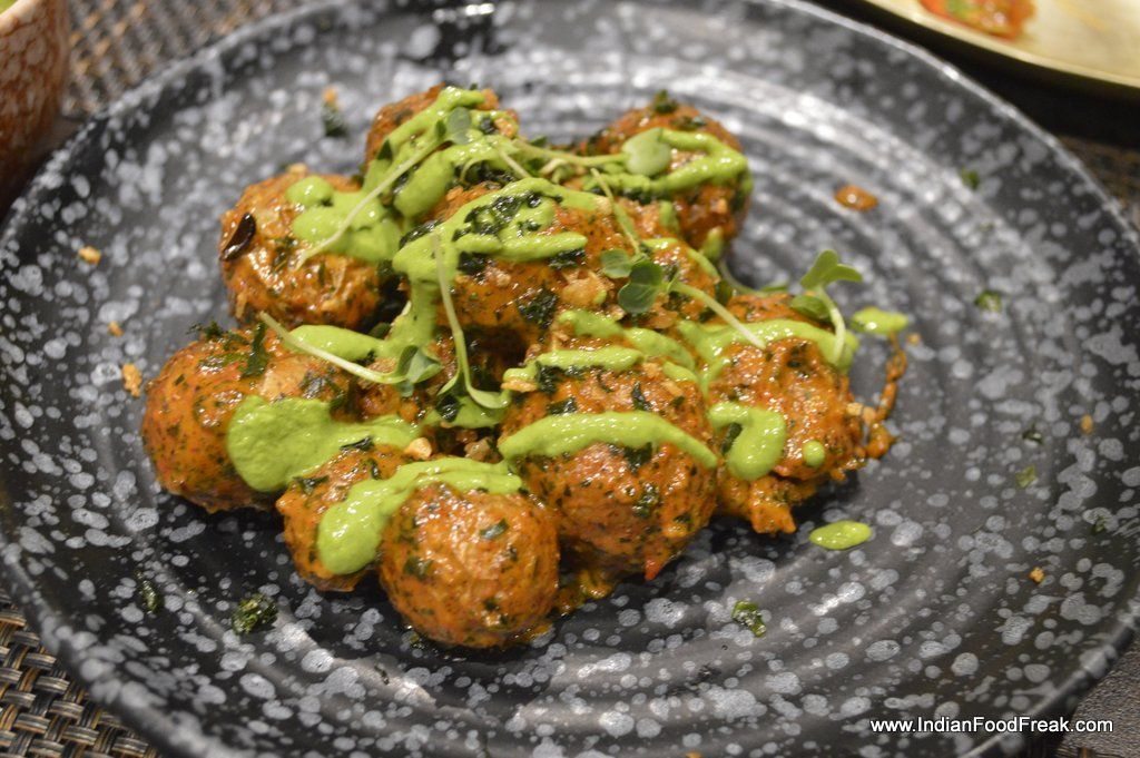 Raan PocketRaan Pockets – twelve hour slow cooked lamb with onion, yoghurt and various spices. The lamb was to die for – slow cooking had as if infused each fibre of lamb with flavour. But what went wrong with it was that lamb was served  inside a roomali roti in a pocket and not rolled like a kathi kebab. Not only was it a messy affair, but half way through, the roomali roti disintegrated because it had got wet with the chutney. Maybe if pita bread was used as was mentioned in the menu, it would have held its own. Nevertheless, a must try dish for the raan.