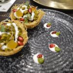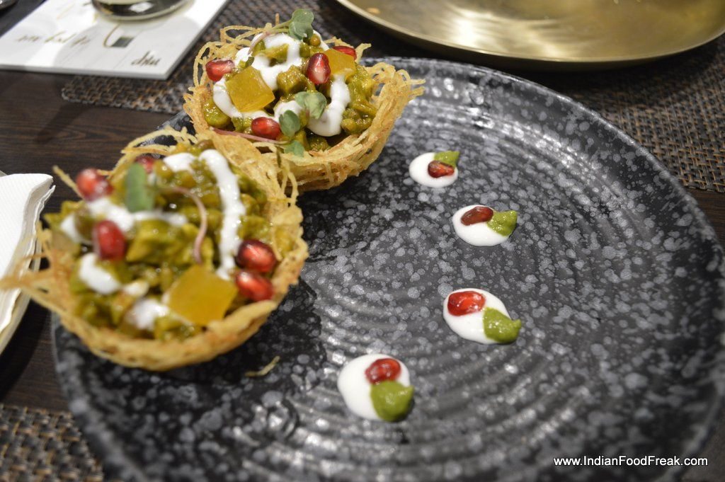 Tokri ChatMy friend and I started with Tokri Chat, an edible, deep fried, grated potato basket with a pre-tossed chat of potatoes, colacassia, sprouts, corn, cottage cheese, kala chana, sweet aam papad (dehydrated mango pulp) in chutney and curd and garnished with pomegranate seeds. Beautiful presentation and takes you immediately to the street of Delhi famous for chats.