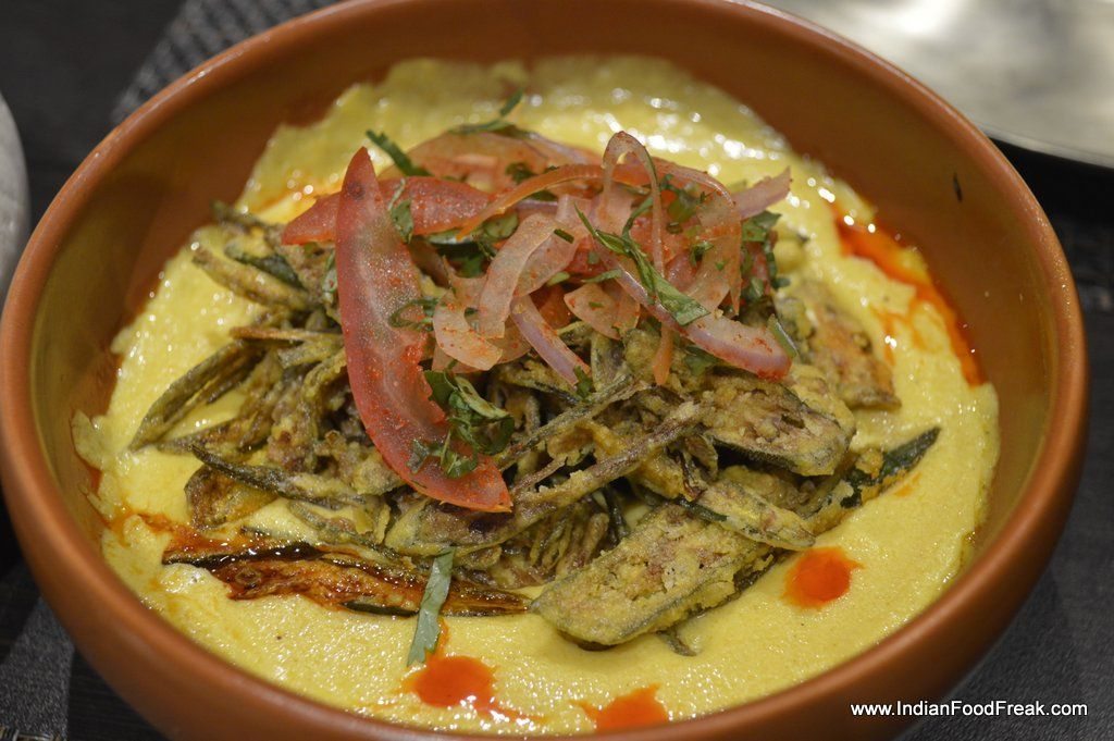 Kunda Dahi Bhindi Kunda Dahi Bhindi – spiced ginger yoghurt karhi garnished with crispy, batter fried, ajwain tempered bhindi and seasoned raw onion. This dish would be loved by every Punjabi who loves his pakora karhi – only pakoras get replaced with crispy bhindi. A must try again.