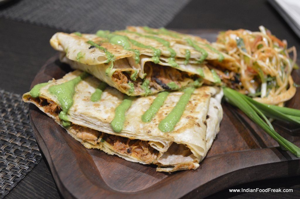 Raan Pockets – twelve hour slow cooked lamb with onion, yoghurt and various spices. The lamb was to die for – slow cooking had as if infused each fibre of lamb with flavour. But what went wrong with it was that lamb was served inside a roomali roti in a pocket and not rolled like a kathi kebab. Not only was it a messy affair, but half way through, the roomali roti disintegrated because it had got wet with the chutney. Maybe if pita bread was used as was mentioned in the menu, it would have held its own. Nevertheless, a must try dish for the raan.