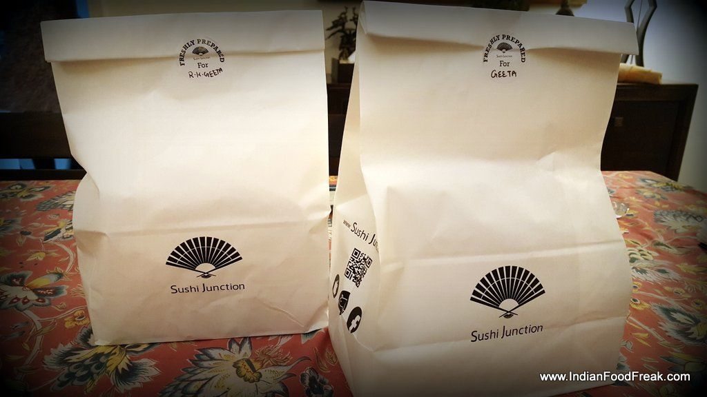 packaging 2The food came in pristine paper bags, neatly presented in plastic boxes, better to retain the moisture in the rice, with accessories like chopsticks, fork etc. all placed in paper pouches. The overall impression was of class, precision, neatness, beauty of form and style. Sushi Junction believes in “food should not merely taste good, but it should also look good”