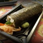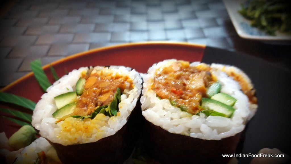 rajma sushiIn a first perhaps, Sushi Junction offers substantial choices in deference to the vegetarians with popular ones like California rolls and many more in vegetarian versions. For the adventurous, they have fusion “Local” rolls like Kidney Bean Curry sauce (Rajma) and Pan seared Cottage cheese (Paneer). Rolls come in large (Futomaki), medium (Hosamaki) and small (Chumaki) sizes.