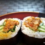 fried chicken with japanese curryYet again, the home train had stopped at Sushi Junction, this time for Red dragon (medium) and Tuna (small sized). The former came crunchy(prawn) with a viscous, sweet Kabayaki sauce and the latter with the simple soy. Both delectable. Kid who is yet to develop a sushi palate, loved the Karaage fried Chicken. With a spicy spike in the otherwise mellow mayonnaise, the fried bits were very tasty. Kimchi chicken rice was so good that I placed a second order of both Karaage chicken and Kimchi rice for kid. Delivery was before time, the black tray-cum-boxes accentuating the colours of the sushi. Spicy Tuna (medium)came with spicy mayonnaise, which was one of the oft-repeated rolls in my orders.