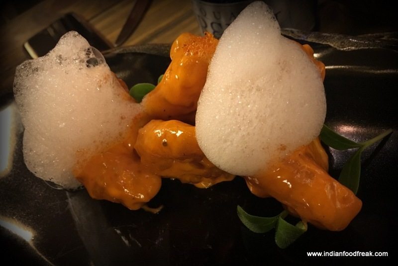 The Raj Kachori with Crispy Okra Salad and the Tempura Dynamite Prawns that came next were both embellished with a crown of light foam. Though the foam itself, missed the mark on flavour on both counts, it certainly amped up the allure of the dishes. It is the crackling okra that I’d go back for on the kachori!