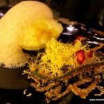 The snow –white amuse bouche that followed was the bold testament to Farzi’s, concept of marrying molecular gastronomy to culinary art. Topped with, a red, berry coulis this teeny jelly blob came in a stone bowl, filled with by chemically crafted airy clouds. This stunning dessert compote exploded in the mouth and certainly raised the bar for the courses to follow!