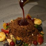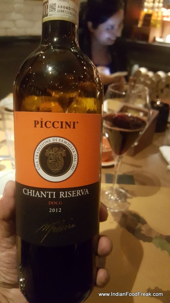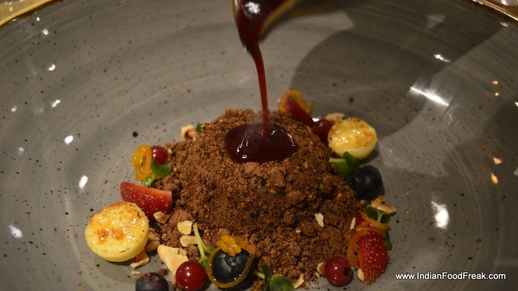 The meal was rounded off with the aptly named Mount Vesuvius, a chocolate cream dessert that starts spouting dramatic looking smoke when sour-sweet raspberry sauce was poured over it. The Coconut –Litchi sorbet was entirely to my liking, not too sweet and refreshing. Homemade Limoncello was aromatic, lemony with just a hint of sweetness.