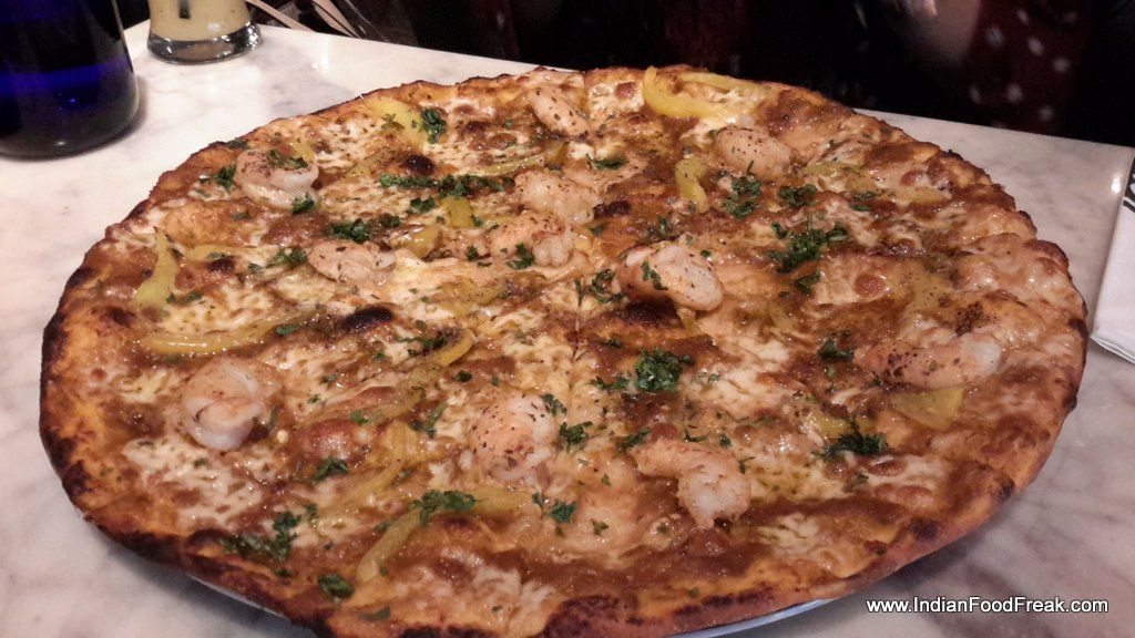 GamberoGambero – prawns marinated in Indian spices on a bed of coriander pesto and passata sauce (especially imported tomato sauce used for pizzas by Pizza Express) garnished with coriander. This pizza did not appeal too much to my taste buds as a heavy coriander flavor seemed to have taken over the whole flavor and the tartness from the passata was missing. Also, the topping of the prawns was too meager – they either need to add more prawns or tear them into smaller bits so that at least each slice has some prawns on it.