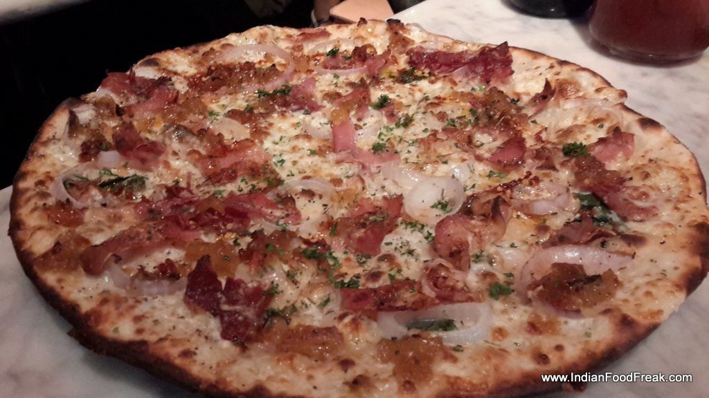 Hawaiian pizza expressHawaiian Pizza Express –Speck ham, pineapple chutney and red onions topped on béchamel sauce with a subtle kick of chili on a thin crust pizza is all one could have asked for to truly tantalise one’s taste buds. I was initially worried when I heard the word chutney but what you get are actually chunky pineapple pieces pre-cooked with a bit of sugar to cut the tartness of the pineapple.
