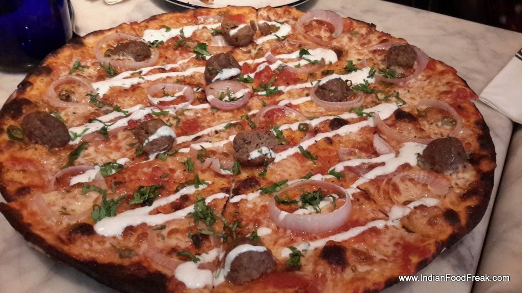 Lamb polpete pizzaLamb Polpette – spicy lamb meatballs, onion rings with a mint yoghurt and coriander topping. This was really nice and the flavors complimented each other. But again the toppings have to be increased. There was actually a slice with no topping on it. I had to break the meatballs from other slices into smaller pieces to use for this slice. Having said that, I was really happy to see lamb meatballs in the menu finally. Even though I used to order the chicken meatballs, I always thought that lamb would lend a better flavor comparatively speaking.