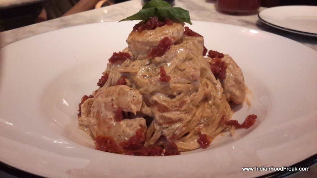 Lamb polpeteOpened the eating account with the starter : Lamb Polpette – spicy and really soft lamb meatballs baked with a tangy pomodoro sauce and served with two bread sticks. If you love your red meat, you’ll notice a world of difference between these and the chicken polpette. I thoroughly enjoyed them.