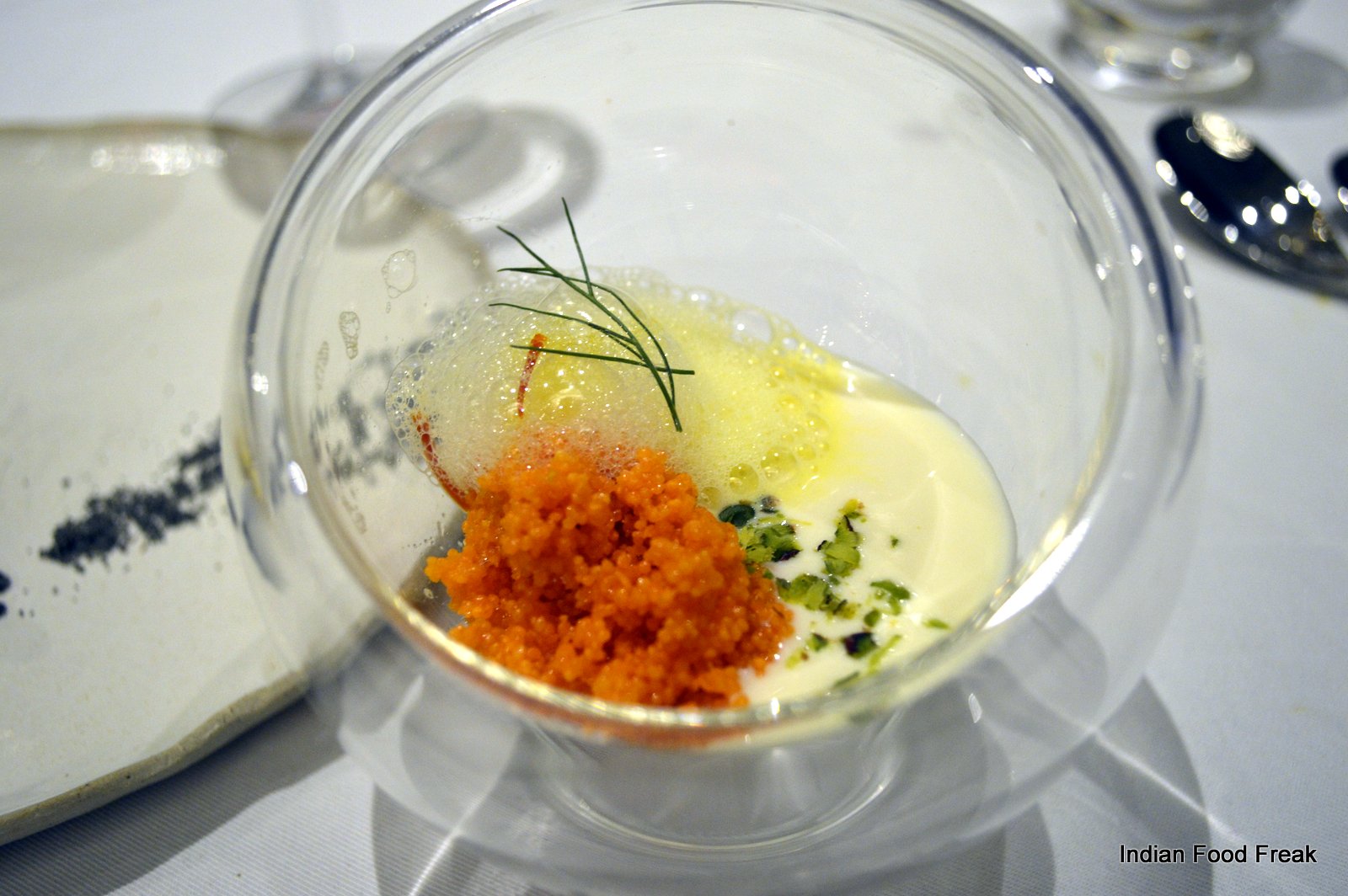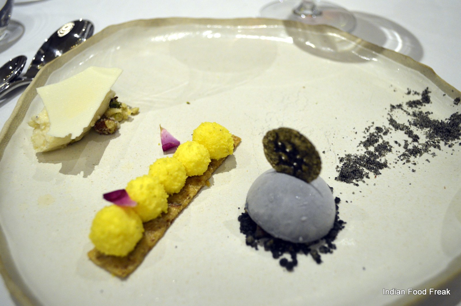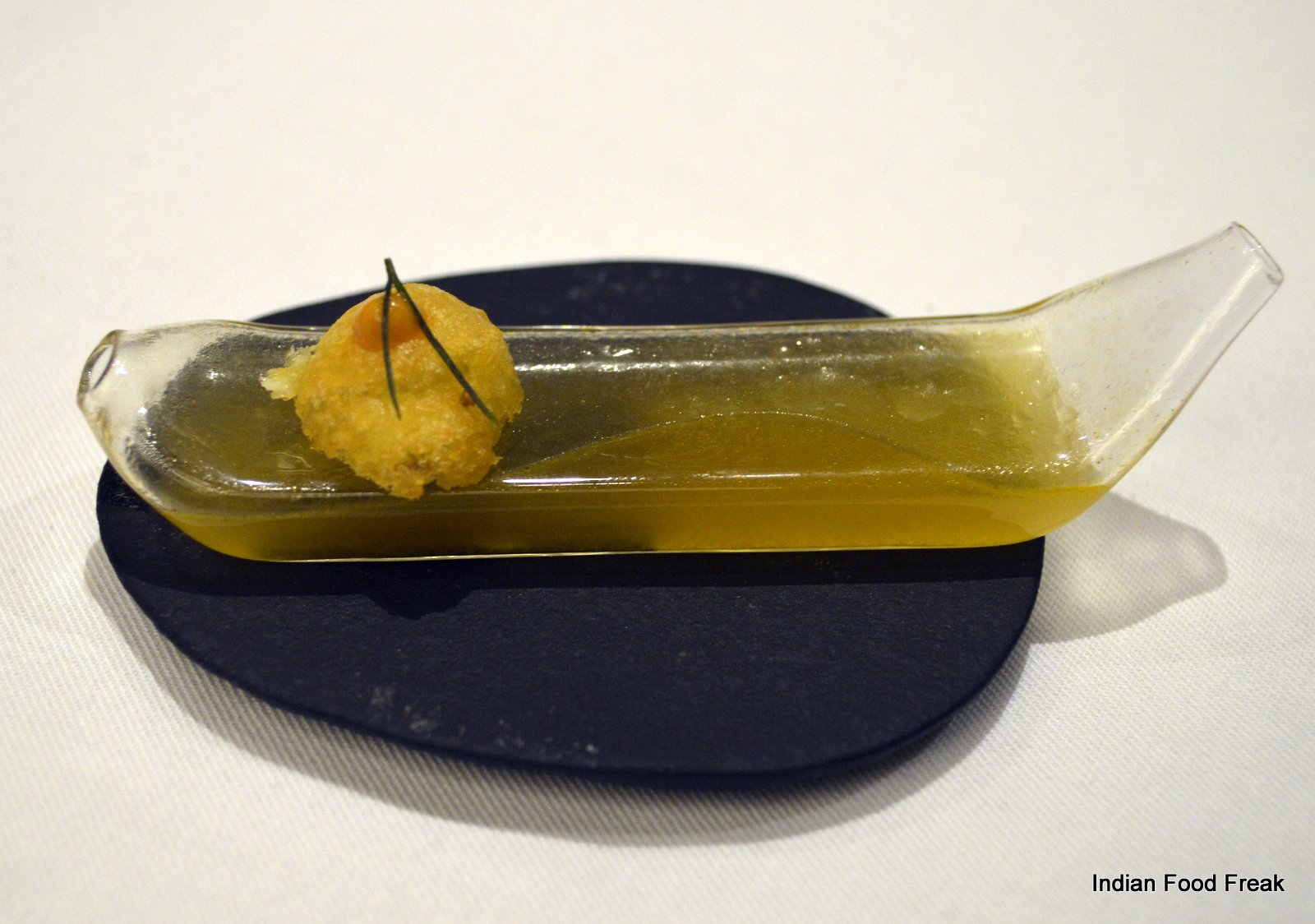 It is highly recommended that you go for the Chef’s tasting menu (both vegetarian and non-vegetarian) which is served at 7.30 pm and 9.30 pm daily. The tasting menu takes ninety minutes to complete as it has – yes – hold your breath – only nineteen courses. So it is very important to understand that one has to be punctual – if you are late, it is like trying hard to get on to a train that has already started. The menu and the small portion sizes tease and tantalize you. It has been so designed that for the most part, it leaves your taste buds asking for more. It is as if someone is being naughty and before you can even feel satiated with the first treat, you are given another treat forcing you to think that you have got a better deal with the second one.