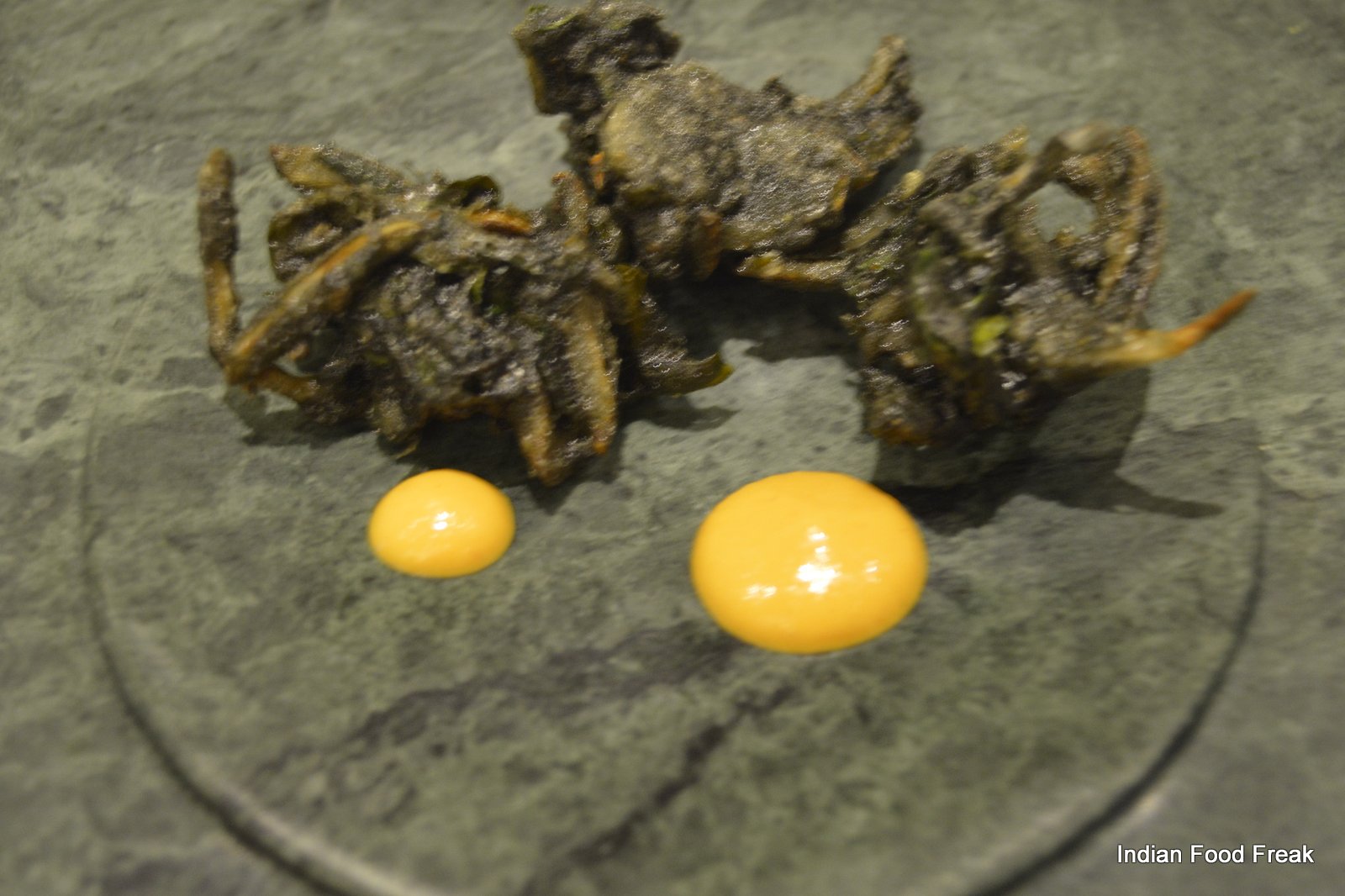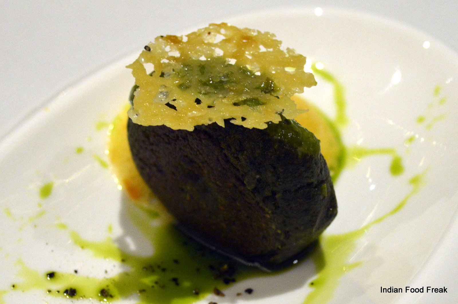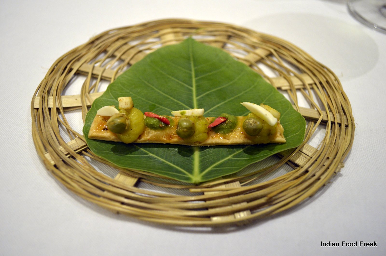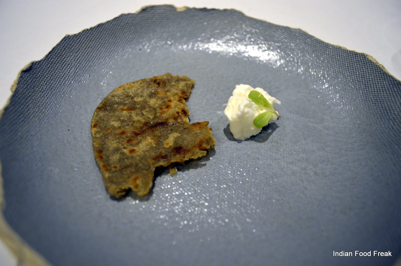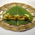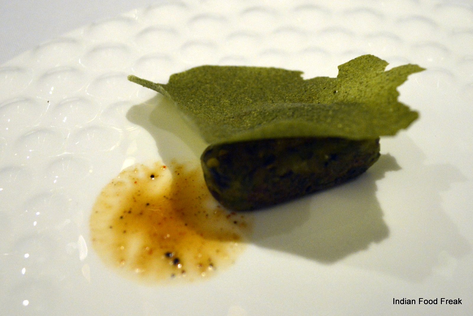 _DSC0079A finger sized portion of a Deconstructed Baked Samosa served on a pipal leaf plucked from outside the restaurant (the pea sized spicy potatoes on top of the baked samosa strip has to be had in three bites as advised by the server) has each bite taking you to any street of India. A hand torn, humble Bajre ki Roti from Rajasthan served with homemade white butter is stuffed with caramelised onion elevating its flavour with the sweetness of the onions.