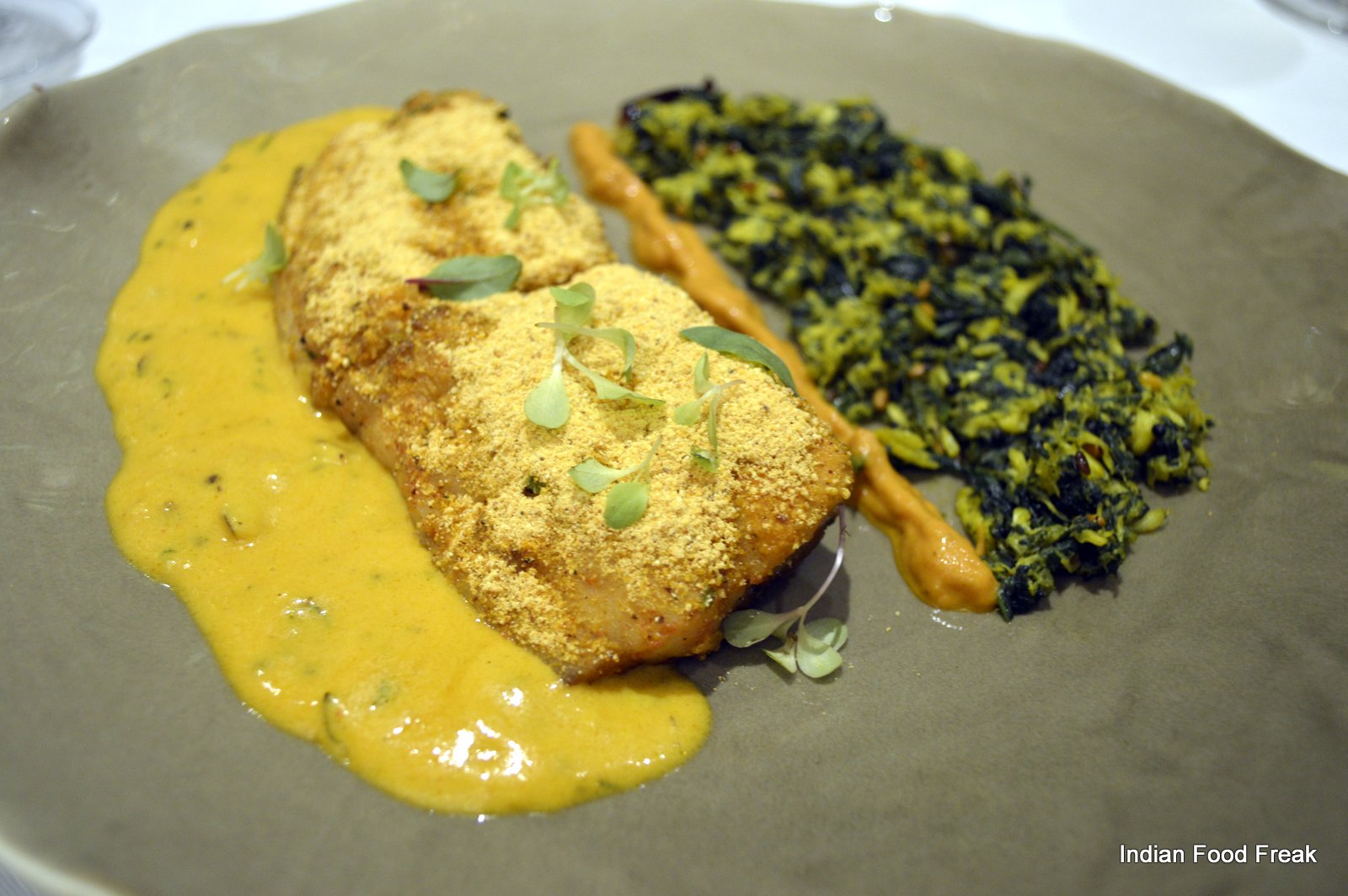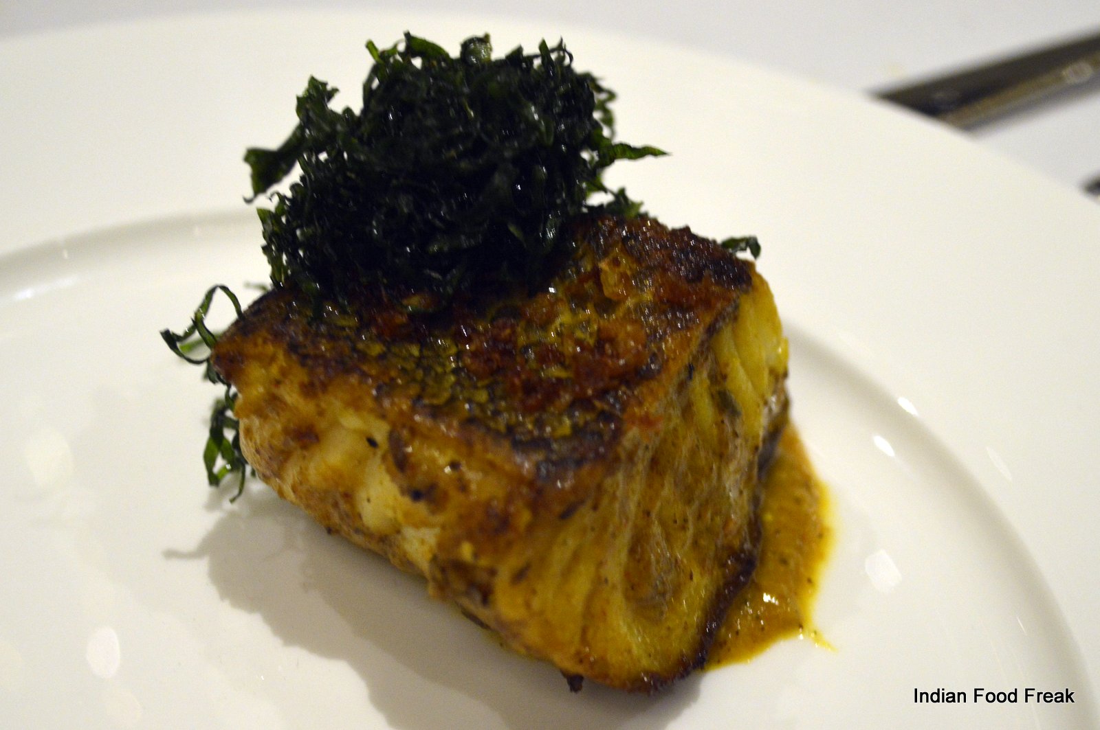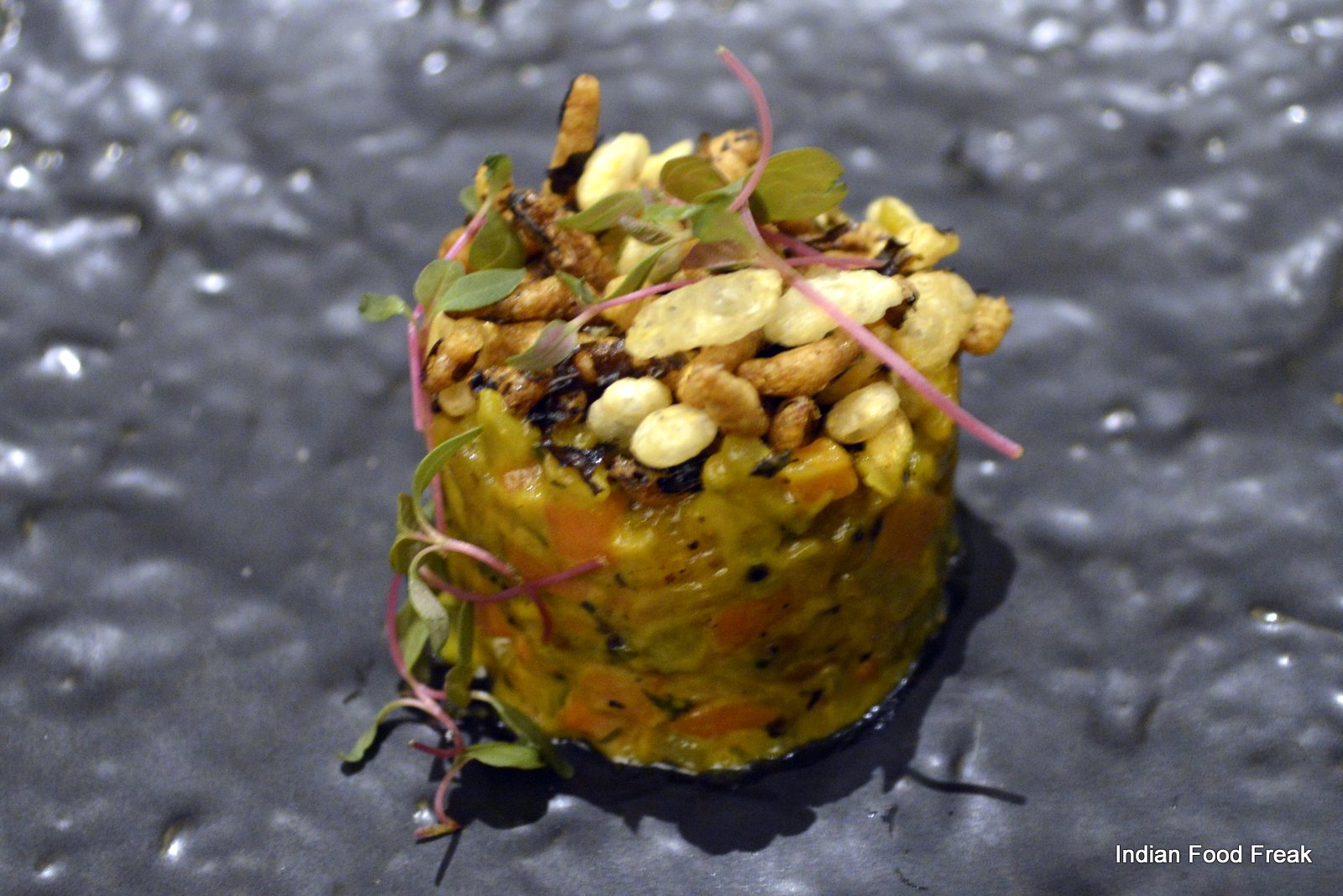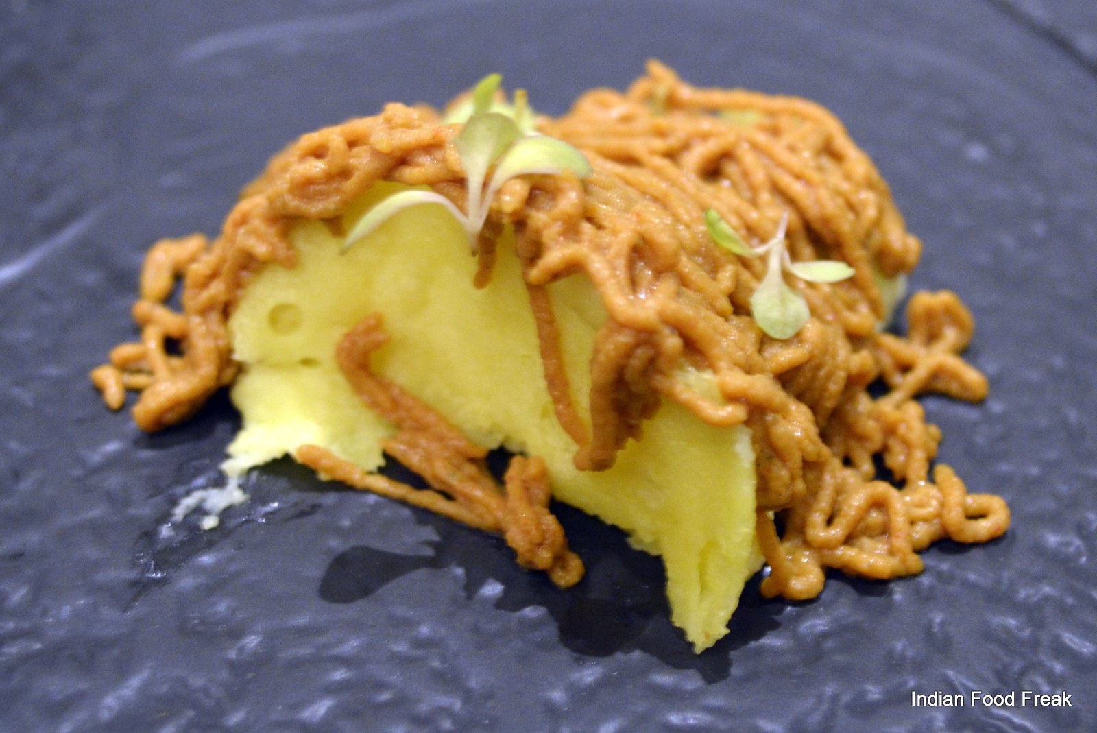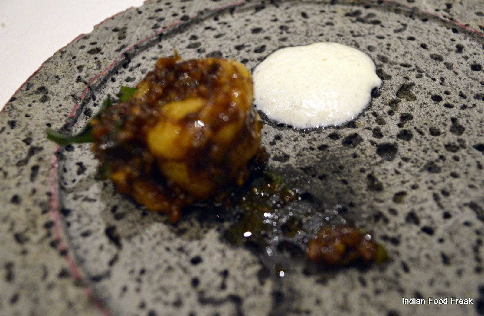 _DSC0079A finger sized portion of a Deconstructed Baked Samosa served on a pipal leaf plucked from outside the restaurant (the pea sized spicy potatoes on top of the baked samosa strip has to be had in three bites as advised by the server) has each bite taking you to any street of India. A hand torn, humble Bajre ki Roti from Rajasthan served with homemade white butter is stuffed with caramelised onion elevating its flavour with the sweetness of the onions.