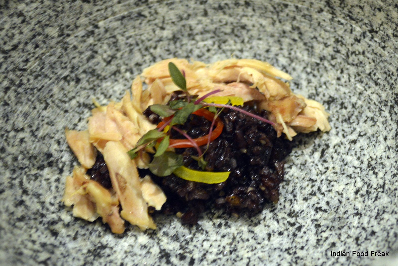 _DSC0086The famous Galouti Kebabs from Lucknow served with air sheermal – the most delicious galouti pate piped onto a air fried sheermal was like an explosion of flavours in the mouth. Curry Leaf Prawn Thayir Sadam – a dish that can be found in Tamil Nadu, Karnataka, Kerala or in Andhra Pradesh where thayir means curd and sadam means rice – the prawns had a lovely south Indian flavour of black pepper, onion, garlic and curry leaves served along with curd rice. Naga Pork braised black bean and bamboo shoots – a mind blowing spicy pork dish from Nagaland. Tawa Keema topped with pickled bitter gourd – another masterpiece of a dish where the keema is cooked with Indian spices, fennel and bitter gourd seeds and topped with pickled bitter gourd. It is pickled for six days in apple cider, sugar and salt. It is a perfect marriage between the two where the acidity from the bitter gourd truly lifts the flavour of the humble keema dish to another level.