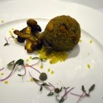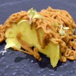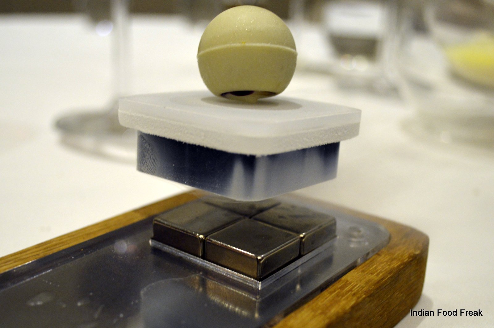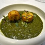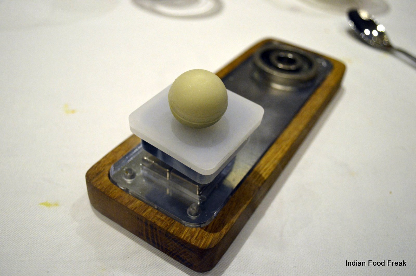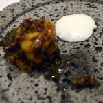 _DSC0073Masala Library’s founding chef Saurabh Udinia travelled to 15 states of India to get inspired and took more than a year to conceptualize the menu. He picked out every day dishes giving them his own modern twist and presented them in specially hand crafted unique serving dishes. Like the amuse bouche is served in a cracked eggshell look alike ceramic dish with a mango spherification and tender coconut inside – when it is served, you feel you are about to eat a raw egg but you know better.