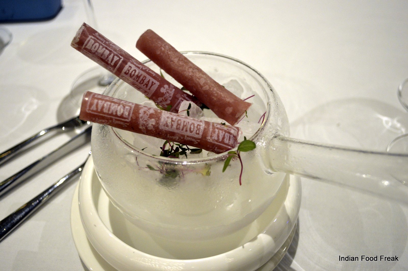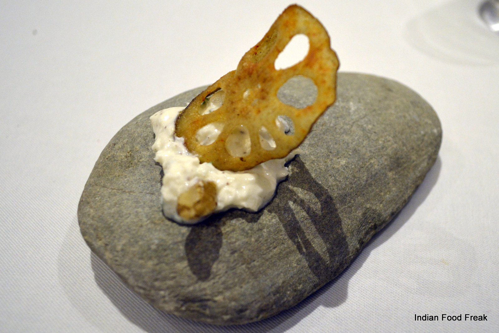 It is highly recommended that you go for the Chef’s tasting menu (both vegetarian and non-vegetarian) which is served at 7.30 pm and 9.30 pm daily. The tasting menu takes ninety minutes to complete as it has – yes – hold your breath – only nineteen courses. So it is very important to understand that one has to be punctual – if you are late, it is like trying hard to get on to a train that has already started. The menu and the small portion sizes tease and tantalize you. It has been so designed that for the most part, it leaves your taste buds asking for more. It is as if someone is being naughty and before you can even feel satiated with the first treat, you are given another treat forcing you to think that you have got a better deal with the second one.