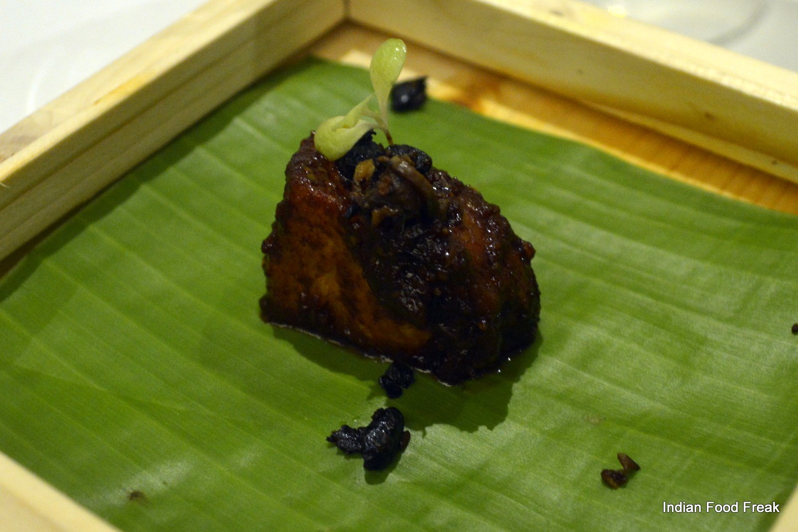 The famous Galouti Kebabs from Lucknow served with air sheermal – the most delicious galouti pate piped onto a air fried sheermal was like an explosion of flavours in the mouth. Curry Leaf Prawn Thayir Sadam – a dish that can be found in Tamil Nadu, Karnataka, Kerala or in Andhra Pradesh where thayir means curd and sadam means rice – the prawns had a lovely south Indian flavour of black pepper, onion, garlic and curry leaves served along with curd rice. Naga Pork braised black bean and bamboo shoots – a mind blowing spicy pork dish from Nagaland. Tawa Keema topped with pickled bitter gourd – another masterpiece of a dish where the keema is cooked with Indian spices, fennel and bitter gourd seeds and topped with pickled bitter gourd. It is pickled for six days in apple cider, sugar and salt. It is a perfect marriage between the two where the acidity from the bitter gourd truly lifts the flavour of the humble keema dish to another level.