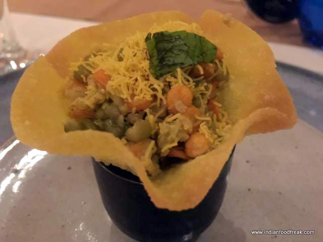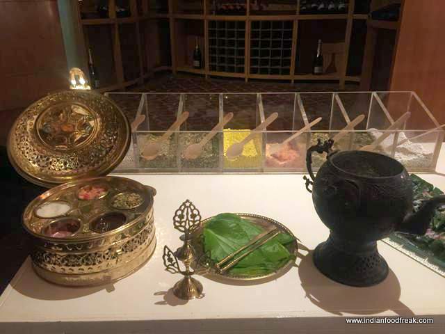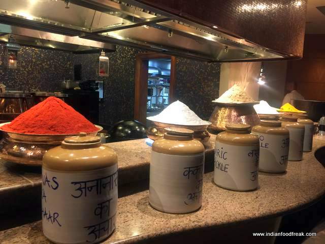 Saffron flovoured Gin & TonicWith appetite going on an overdrive at the very thought of Nawabi delicacies, I sat nursing my Saffron flovoured Gin & Tonic (try it – gives a whole new twist to the regular mundane drink) at the “Taste The Tradition” dinner. Rows of pickles and heaps of spices gave me plenty to peep into. Amuse Bouche was brought to the table – Pani Puri with a twist which was rather difficult to get into one’s mouth; I prefer a regular puri which fits into my mouth.