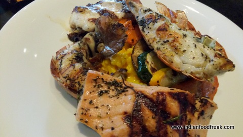With a few like-minded foodies, there I was on a Saturday afternoon getting ready to learn the techniques of a perfect seafood grill. Chef Cabrera showed us how to perfectly marinade and grill a salmon, a lobster and a sea bass. Chef first used a very simple marinade of thyme and olive oil and kept aside the pieces for 10 minutes. Then he put the fish pieces on the grill and pressed a little with the hand. Chef insisted that the grill must be very clean or else the flavors will not come through. He poured few drops of olive oil and rubbed rock salt and pepper over the fish pieces. When one side was done, he flipped over the other side. Now put the lobster pieces. Chef Cabrera told us that it was important to keep the shell of the lobster as it has the actual taste and flavor. Chef said be very patient with the grill or you will not get the result.