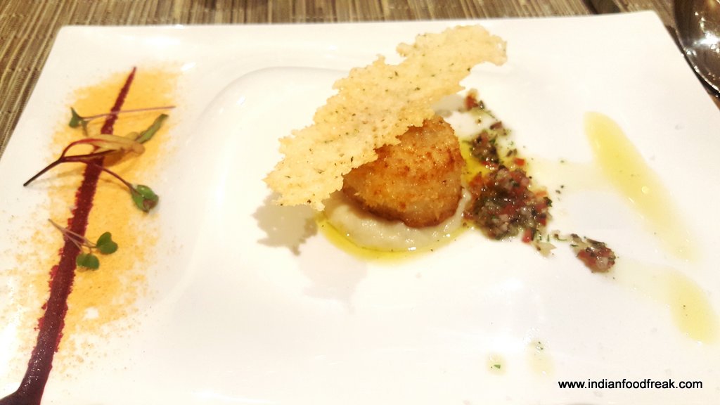 The Bella Cucina version of Caprese Salad came with lot of drama where Sous Chef Amit Kumar gave a molecular twist to the ingredients. While I loved the tomato froth that was served on the side, I missed the bocconcini cheese chewy bite as it was replaced by creamy mozzarella. My wife’s Compressed Beetroot Salad that came with goat cheese snow was just perfect.