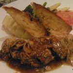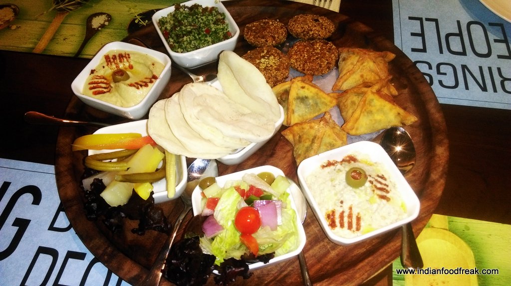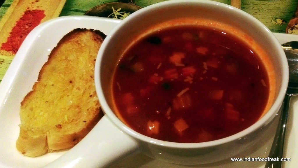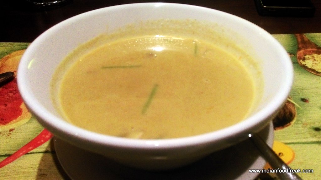 We started with Veg Minestrone Soup (Rs 240), Chicken Penang Laksa Soup (Rs 375), the House special Mezze Platter (Rs 450) and Thai Roasted. Originated from Italy, the Minestrone is a thick soup with seasonal vegetables and pasta in it. The soup had the flavors, but feel the consistency should have been tad thicker. The Laksa soup, with its origination from Malaysia, had the required rich coconut milk flavor and tasted very good. The Mezze platter had Falafel and Fateyar served with Hummus, Babaganosh, Tabbouleh, Fattoush, pickled salad and Pita bread. The juicy Fateyar had spinach filling and the falafel was well done with required crispness. Barring exception of Tabbouleh that missed on the mild bitterness of parsley, other accompaniments were brilliant. The Thai Roasted was none other than chicken satay. The roasted chicken on a skewer was succulent and had lovely flavor of lemon grass and had a pinch of spicy taste towards the end. Served with peanut sauce the Thai Roasted was a good choice to have been ordered.