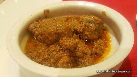 Suprio Bose joined me, as did Executive Chef Ashish Bhasin; Sweetyji with his trademark hospitality offered to choose the appetizers for us. We opted for a fine Chilean Shiraz from the stables of Baron Phillipe de Rothschild to accompany us on the feast. First to arrive was the Sheekh Kebab (INR 1825)…what a burst of flavours it was! Succulent is the word..in fact I couldn’t remember if I had a better sheekh anywhere. The Bhatti Da Paneer (INR 1075) with its spicy marinade, charcoal grilled flavour and the tender soft paneer had the moaning in pleasure. The Chowk di Mattar Makai Tikki (INR 1075) continued on the same note. The Bhatti da Meat (INR 1825) – oven roated lamb which was perfectly spiced and my mouth was in gastronomy paradise with the perfect symphony between the superb meat and the spices.