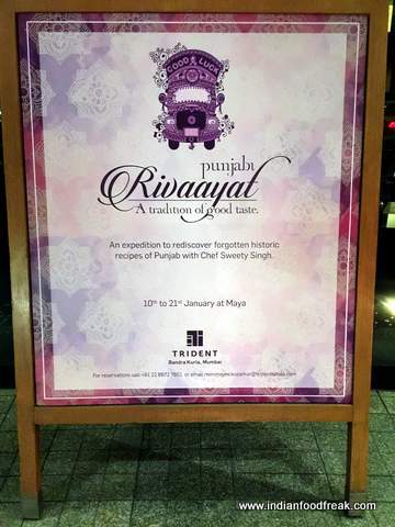 I eat Punjabi food on a regular basis, I don’t dislike it, I don’t go ga ga over the cuisine either…so when my partner in food crime, Suprio asked me if I’d like to attend the Punjabi Rivaayat at Maya, Trident BKC, I probably sounded a little “oh ok”…. “You’ll like it” was the response, “I attended the previous edition and Chef Sweety Singh had worked wonders”