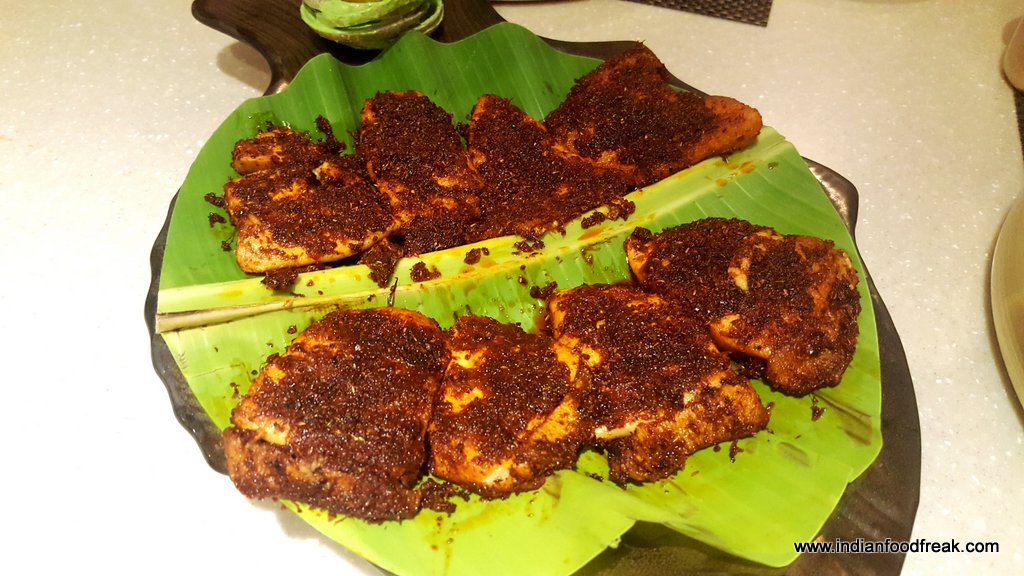 But my favourite here are Meenpacche masala (Kingfish marinated with green chili and spices cooked on hot pan inside a banana leaf) and Maanjitawa fry (Pomfret fillet prepared on hot pan). This pomfret seems easy to do and I will surely try it at home soon. It is marinated in lemon and salt water for around 15min, and later in dhania, jeera, red chilli using mustard oil. It is later pan seared in coconut oil. Try it and you will surely love this.