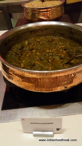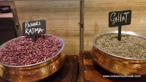The Chefs laid down a buffet at JW Café, JW Marriott Sahar called “Flavors of Garhwal” from 1st March till 12th March featuring this unique but lesser known cuisine. IFF was invited to be a part of this experience and thus we landed there for dinner. The dinner buffet was as usual a HUGE affair. But we decided to stick to ONLY “Flavors of Garhwal” and not to mix any other flavor. And aren’t we glad. This definitely needed all our attention. Chef Rajesh introduced us to the different types of Rotis / Rice preparations and Curries. The Pahari Rajma Tensu, completely pasted Rajma made into a gravy, I had for the first time. Along with it we had Gahat ( Kulath) ke Parathe and Mandua (Ragi) ki roti. Apart from that, there were Hara Pyaz ki Kapli , Jahkiya Pulao, Bhangjeer ki Khchdi, Aloo Techwani, Murgh Kashmiri made with green herbs from Garhwal and Meethi Puri. I loved the meethi puris with the Kashmiri murgh. It’s only later I realized those puris were for dessert actually. But I loved the pairing nevertheless.