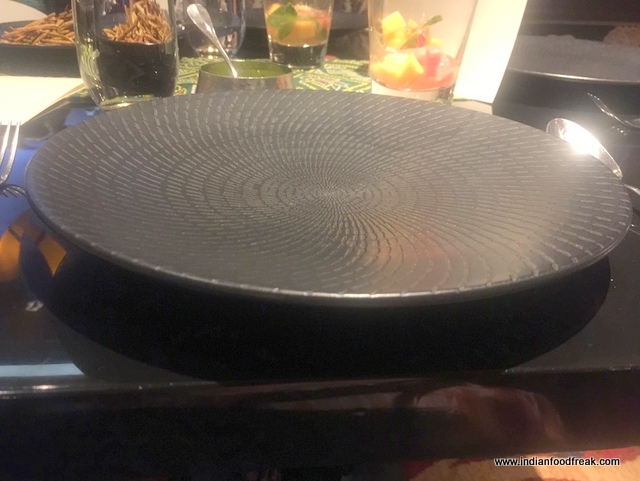 Upon entering, I found the set up very typical of a fine dine inside a 5 – star. Elephant tusks (not the real thing of course) hung here and there as if to emphasize the name. Chef (Maharaj)JankidasVaishnav explained that he had personally travelled to far flung places in Gujarat and Rajasthan in search of new dishes for this menu; the veteran Chef managed to get me interested and I was now keen to sample what was on offer.