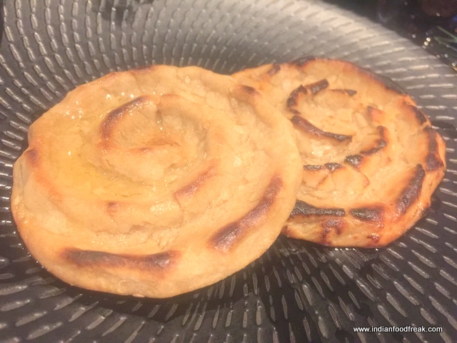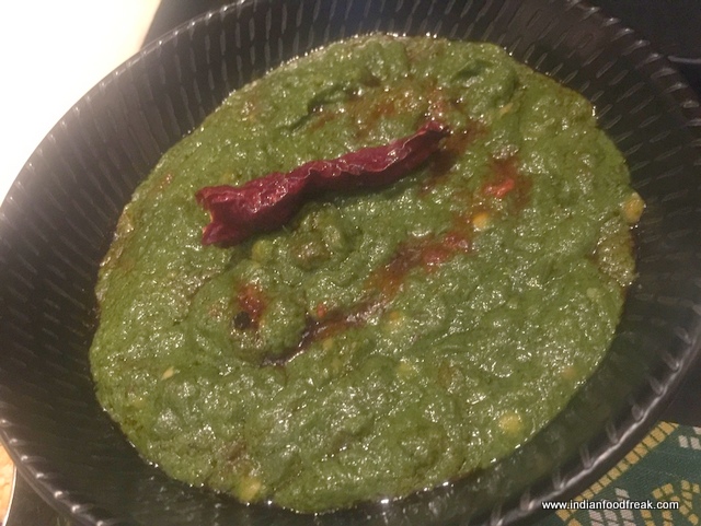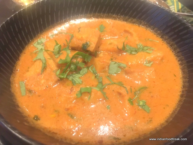 TheRatalo Ki Tikki (INR 870) – purple yam, sweet potato and beetroot cutlets stuffed with some spiced mixed dal didn’t look too appealing to me. I am not fond of yam at all. Chef encouraged me to try it and I was pleasantly surprised – they were spicy, soft and had a cornmeal texture, not bad at all although a little dry and needed the chutneys served along with it. I was a tad disappointed with the BharwanPaneer (INR 870). The flavour felt like a mix of tandoori paneer and a bit of Acharipaneer, couldn’t find much about the chillies from the Rajasthani village, Mathania, which I was supposed to feel.