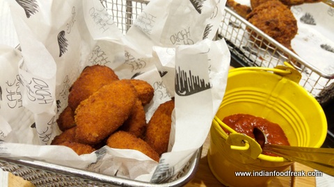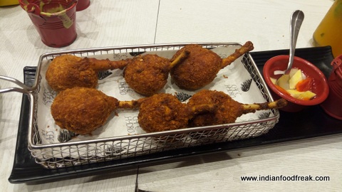 The menu was printed like a newspaper. Rahul, the restaurant manager, was running from here to there to make sure everyone was looked after and people were enjoying the food. We decided to go by Rahul’s suggestion and settled for Desi Chilli Poppers (Rs.190), Crispy Chicken Pops (Rs. 250) and Chilli Garlic Fish Bullets (Rs. 275). The specialty of their seafood is that they use Surimi paste. Some may find it slightly strong on the aroma and the taste, but we liked it.