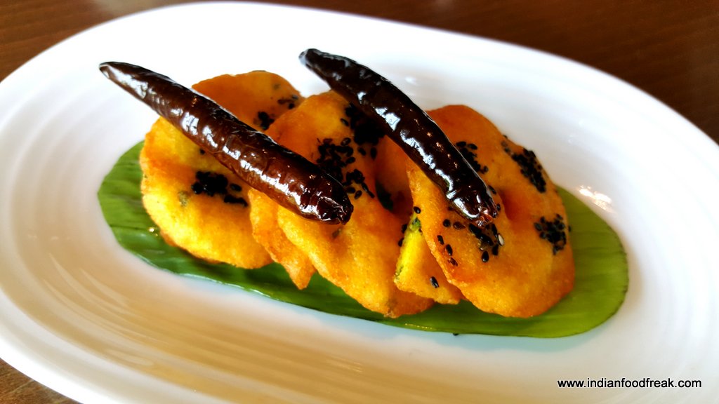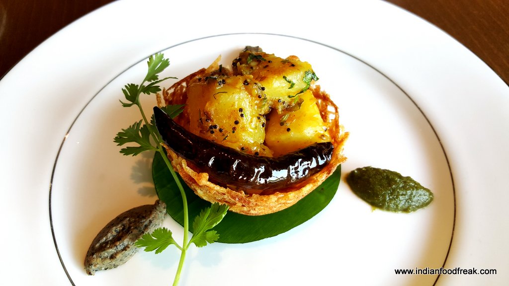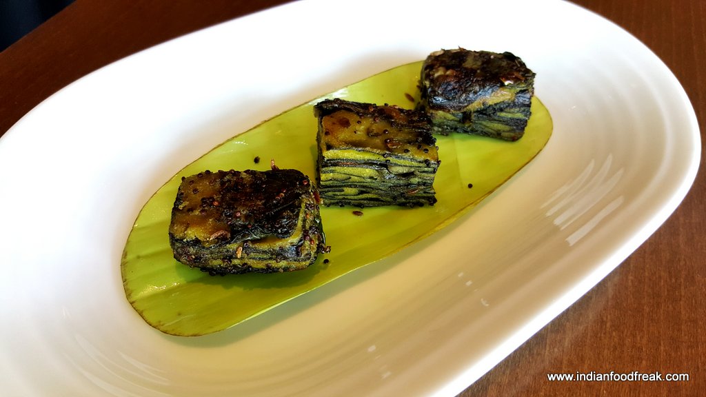 Then started the round of snacks with Aloo ke Guthke — a Kumaoni snack and a North Indian favourite dry vegetable of potatoes tempered with turmeric, wild mustard or Jakhiya and whole roasted red chillies. The Urad Dal ki Pakori was one of their best items of the fare and was repeated by most of the people. These were similar to South Indian vadas in taste, although thinner and crispier, garnished with black sesame seeds. Patyud was the next starter in the row made from colocasia leaves, tempered with Jakhiya seeds and pan fried. Until this time, we realized that one could even enjoy a nice vegetarian meal that too if it is well prepared. However, we were informed that there was non vegetarian in the next courses of the meal.